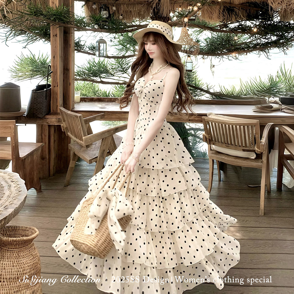 SISI JIANG "Roman Holiday" French Vacation Gentle Polka Dot Waist Slimming Fashion Suspender Dress