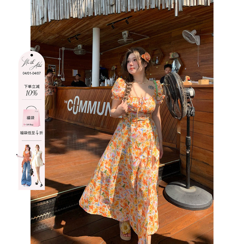 Lazy Didi Hand-pleated fishbone floral skirt vintage upright cut U-neck sweet sundress