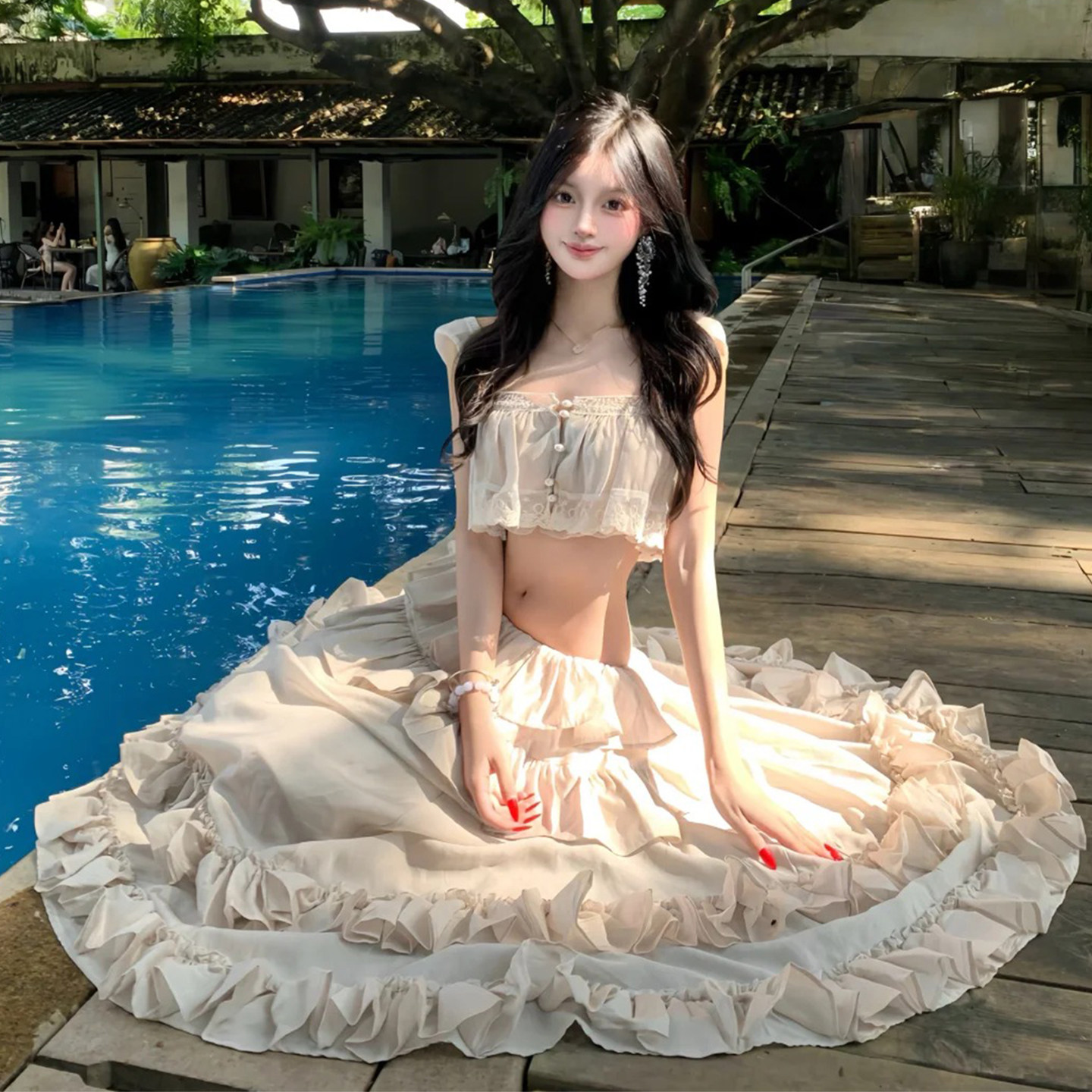 French beautiful island resort ruffled split suspender dress super fairy princess style atmosphere set