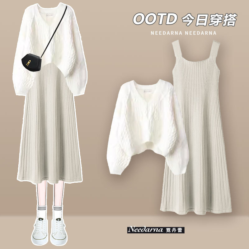Knitted bib dress early fall 2025 new small pre-fall French long skirt sweater two-piece set