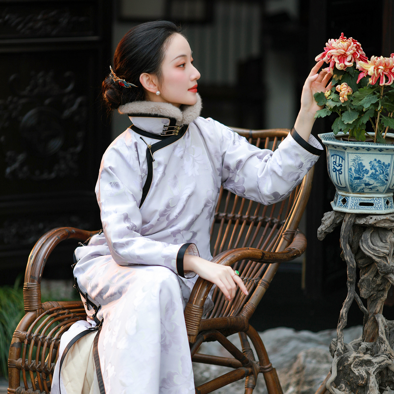 Purple Mist Flower Shadow丨2025 Winter New Model丨Retro Republic of China Style Jacquard Satin Ingot Collar Thick Cheongsam with Cotton