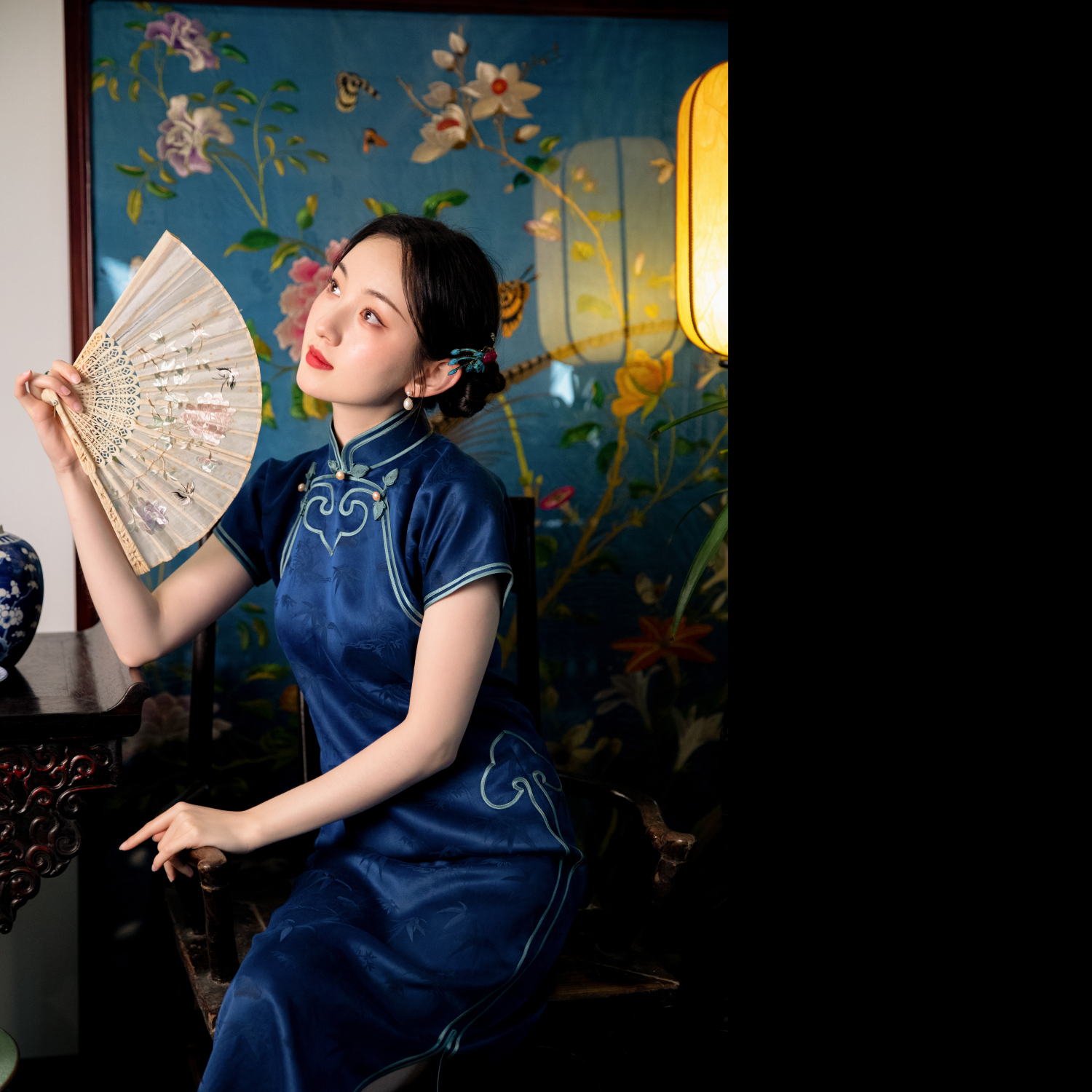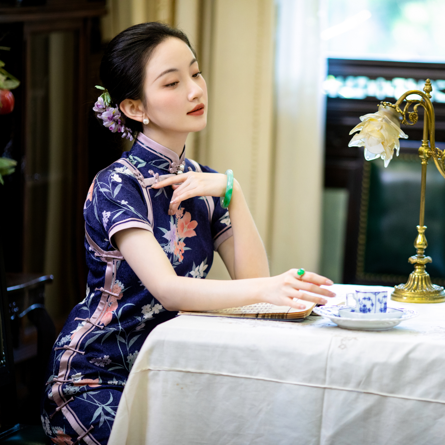 Slightly cool under the moon|Silk spinning fragrant cloud yarn on the moon on the west building, quarter sleeves are not saved, double placket, retro slim ancient cheongsam
