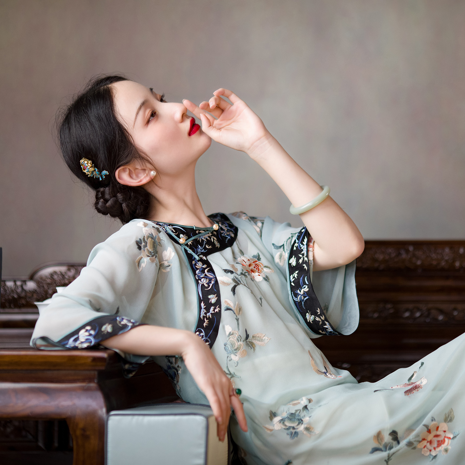 The green wind is like a butterfly丨A city of fluff丨Imitation of late Qing antique clothes, embroidered collarless, inverted long-sleeved cheongsam skirt, thin original