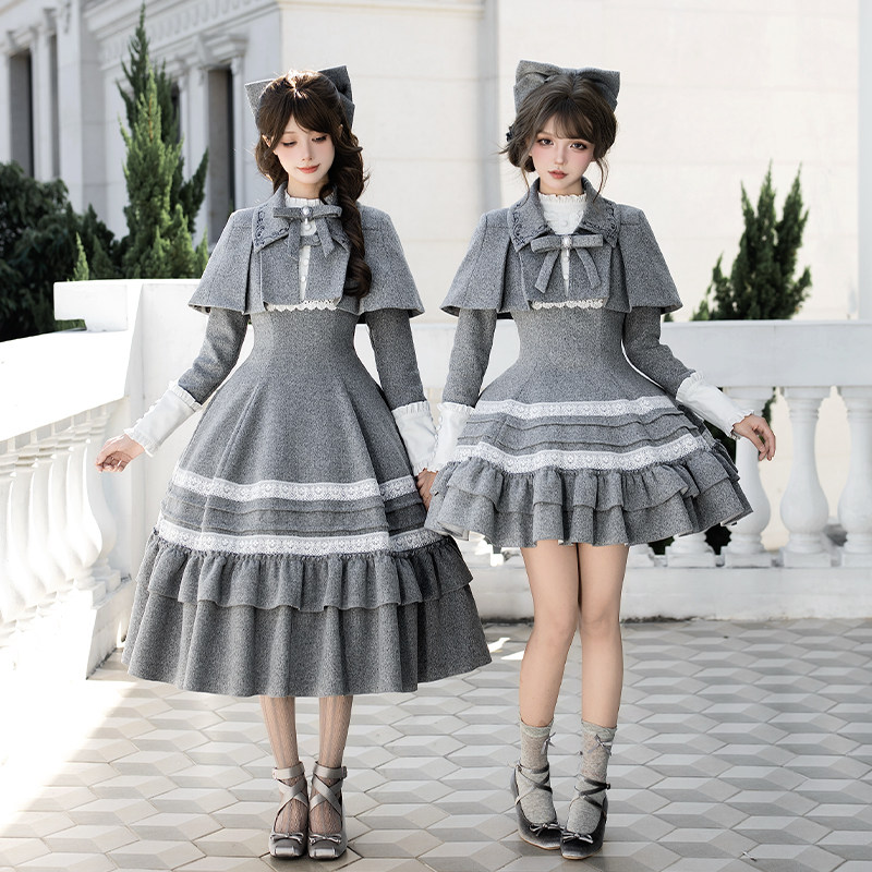 Letters and poems, old memories|WP original sub-brand elegant gray ruffle op small cloak twin winter lolita