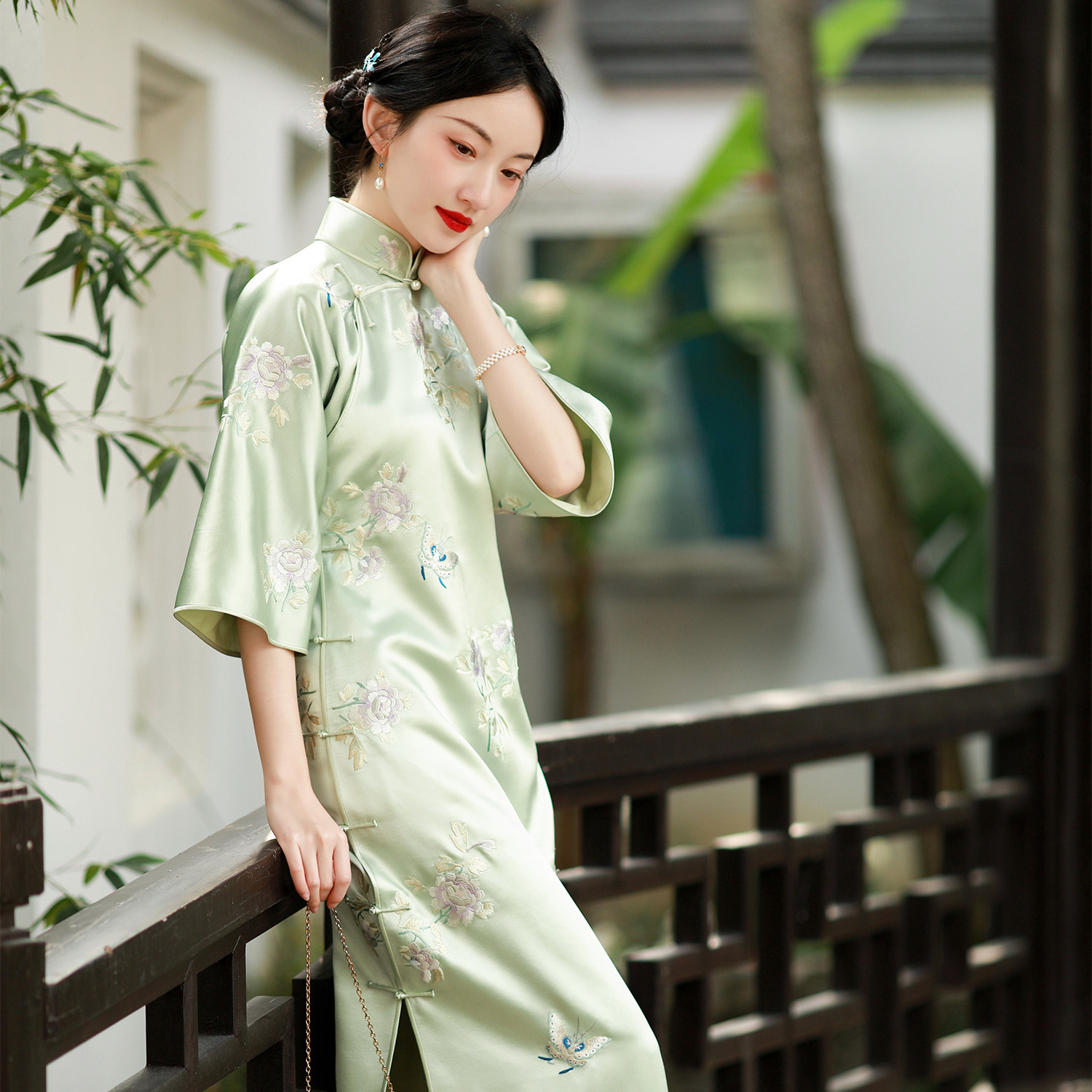 Ming Zhi Qingxiao丨A city of wind丨Acetic satin elegant embroidery inverted long-sleeved cheongsam skirt young daily life