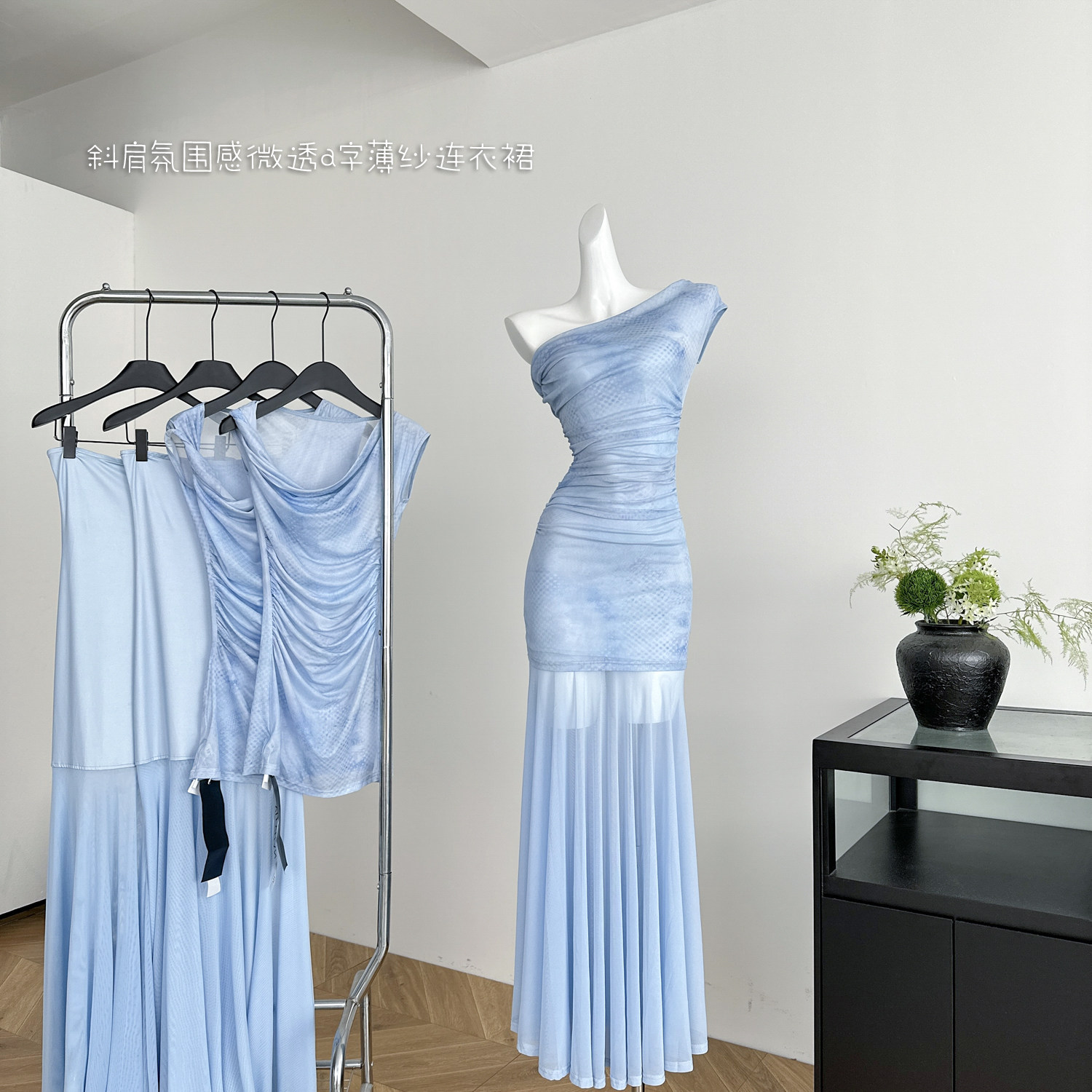 Youni's homemade salt tea blues original French slanted shoulder atmosphere slightly translucent A-line tulle dress