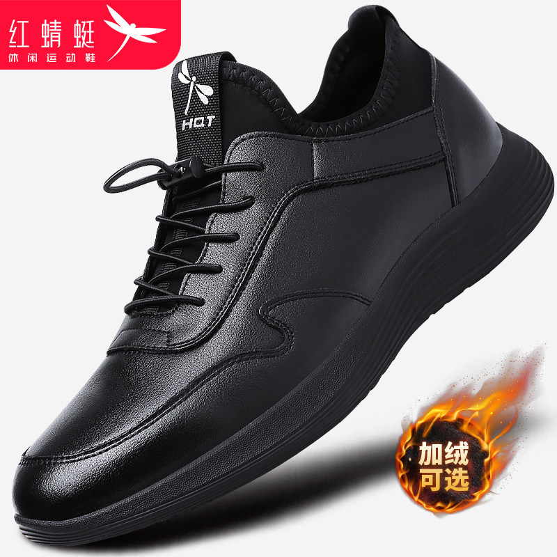 Red Dragonfly Men's Shoes Winter New Fleece Athleisure Leather Shoes Men's Genuine Leather Soft Sole Cowhide Waterproof Travel Shoes