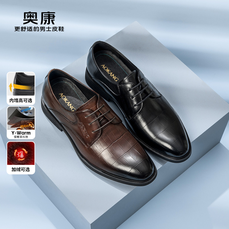 Aokang men's shoes spring and summer British fashion plaid business dress leather shoes leather comfort heightening groom wedding shoes