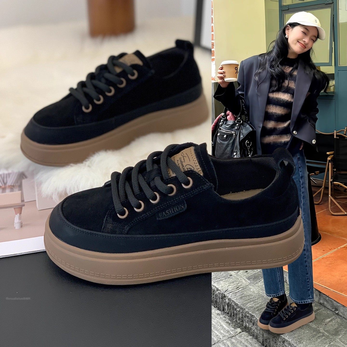 Hong Kong leather warm fleece low-top board shoes platform women's 2025 autumn and winter new retro platform bread casual shoes