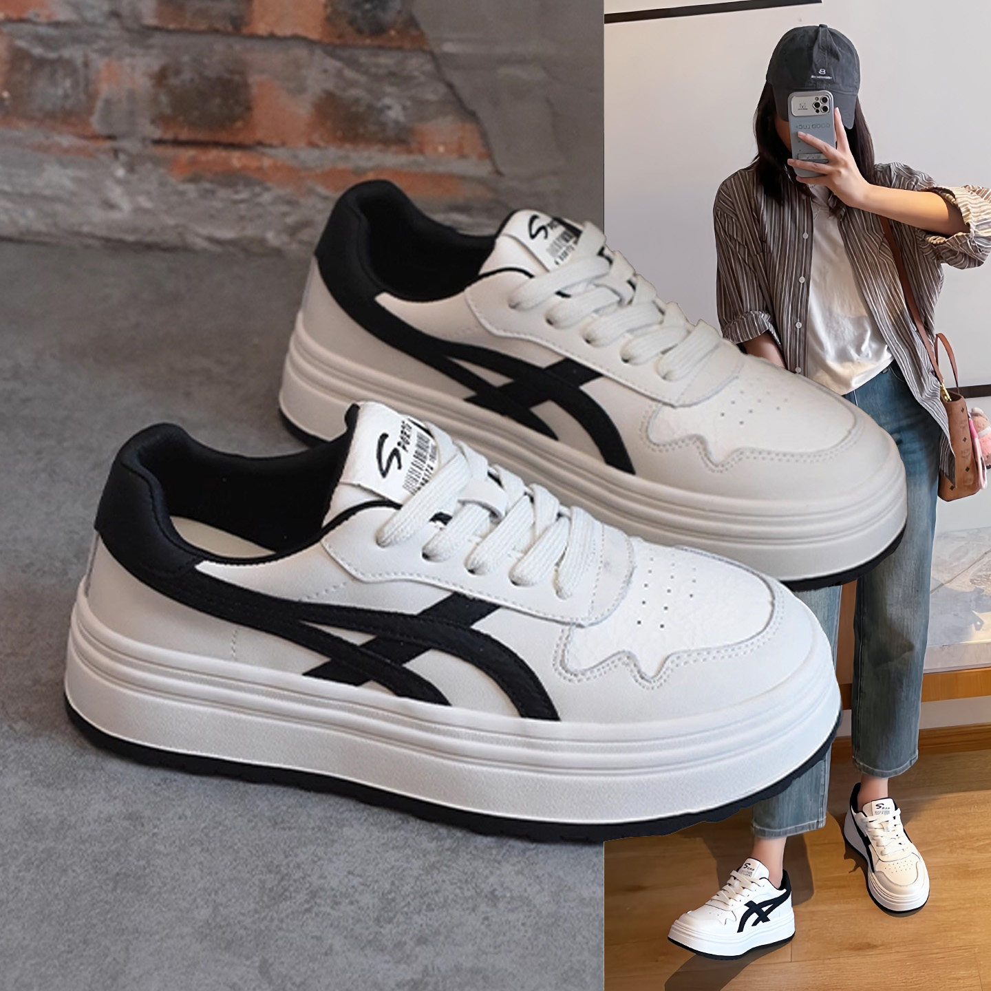 Hong Kong Versatile Board Shoes Women's 2025 Spring and Autumn New Korean Fashion Black and White Leather Lace-up Thick-soled Casual White Shoes