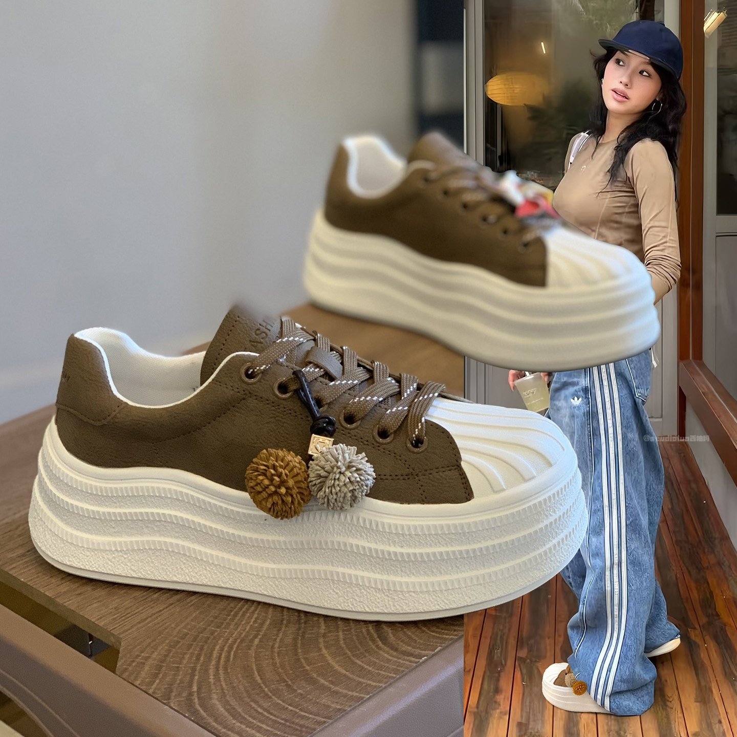 Hong Kong leather platform sole heightening pop crack casual board shoes women's 2025 spring and autumn fleece white shoes fashion sneakers