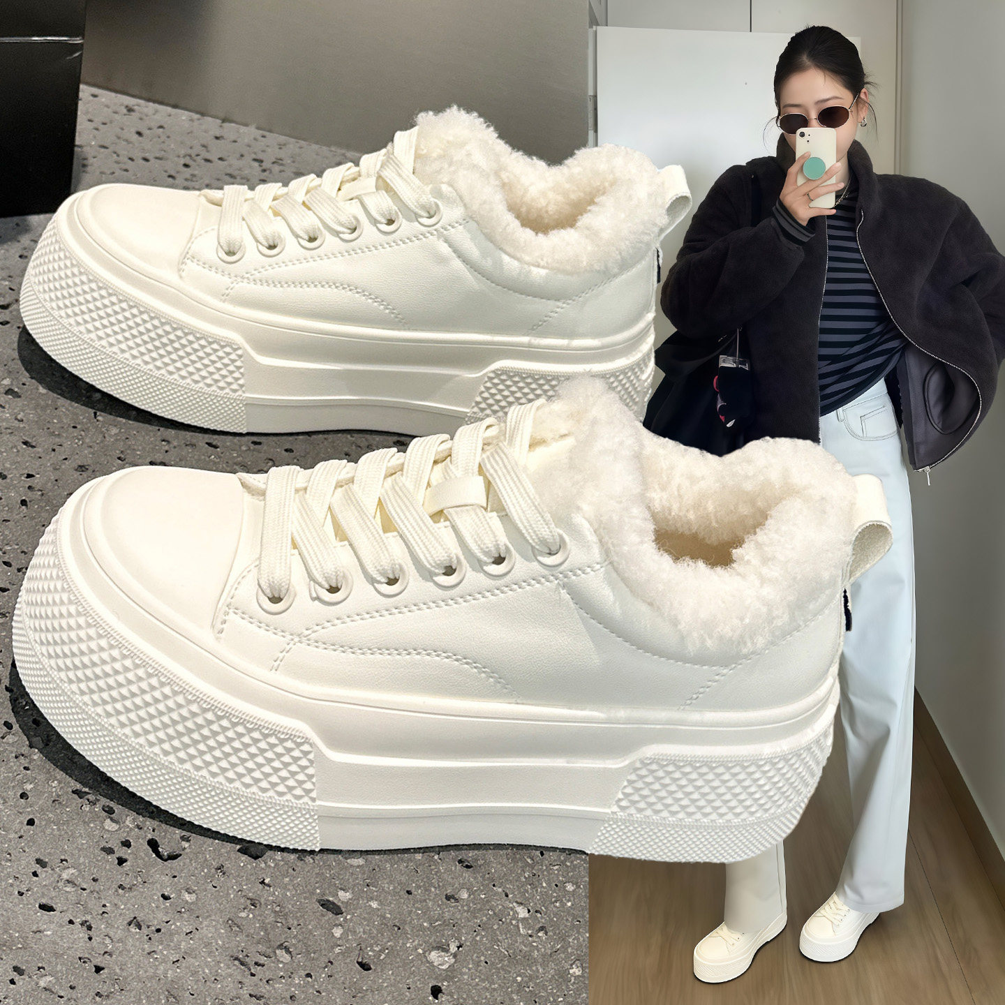 Hong Kong leather small thick sole heightened fleece white shoes women's winter lamb fluff wool shoes versatile casual board shoes