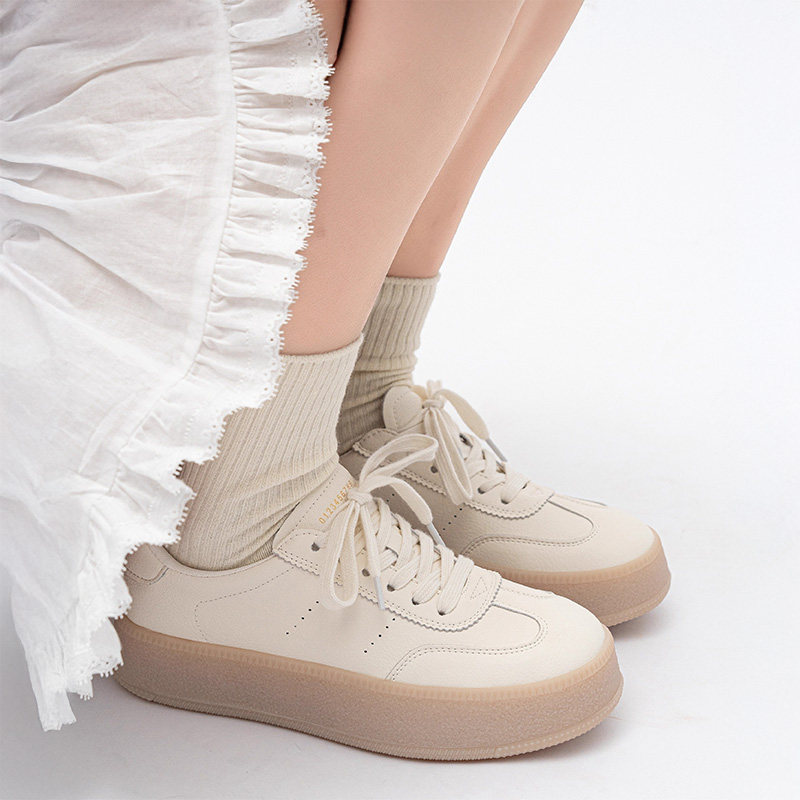 "Shoden" leather thick-soled white shoes women's 2025 new models with increased height laces and round toe white breathable board shoes