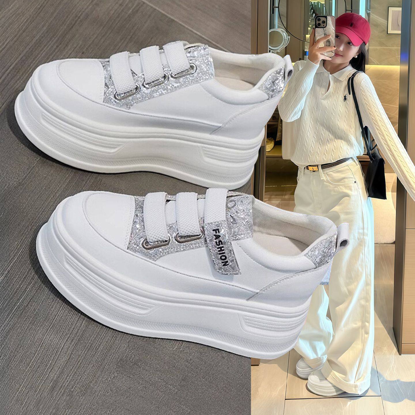 Hong Kong Height Increase Little White Shoes Women's 2025 Spring and Autumn Thick-soled Muffin Women's Shoes Velcro Rhinestone Casual Sneaker Shoes