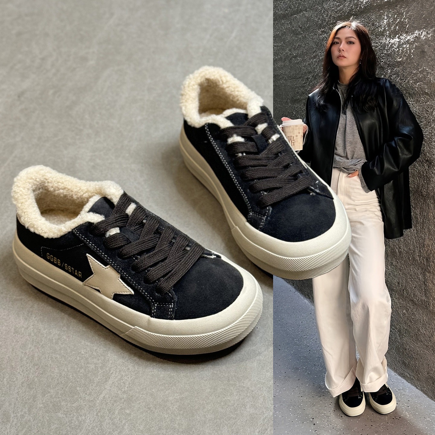 Hong Kong Warm Platform Wool Shoes Women's 2025 Winter Lamb Wool Cotton Shoes Velcro Leather Plush Casual Shoes