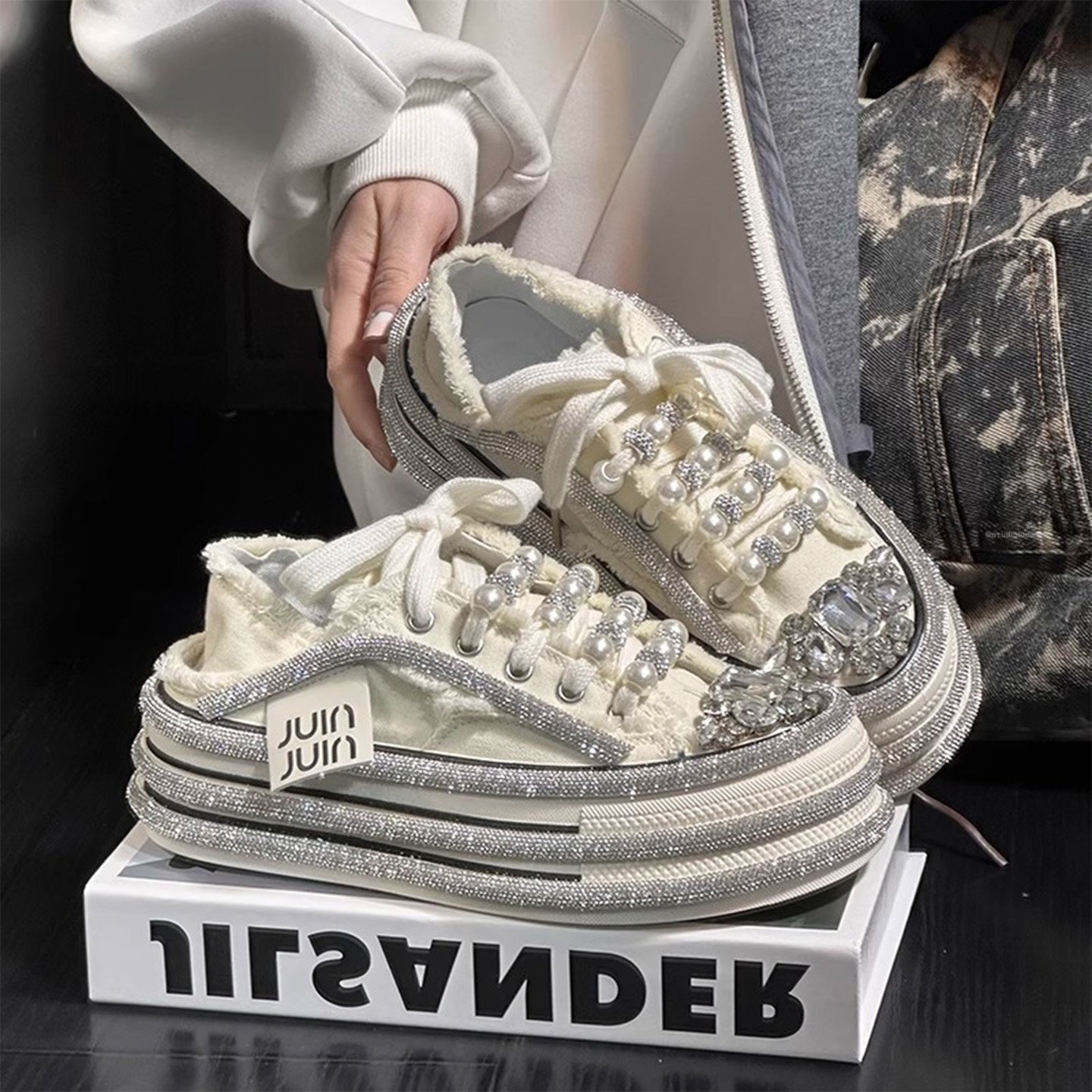 Hong Kong rhinestone pearl muffin platform canvas shoes women's 2025 summer new small versatile height-increasing casual board shoes