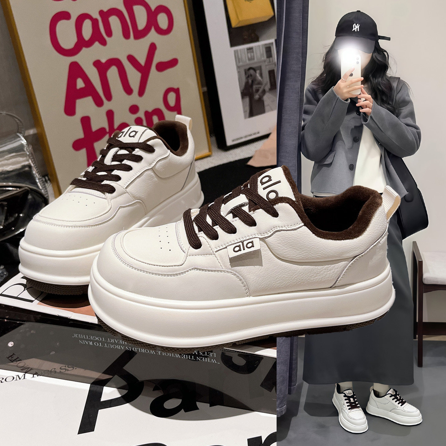 Hong Kong leather platform sole heightened bread white shoes women's 2025 autumn and winter fleece casual sneakers versatile board shoes