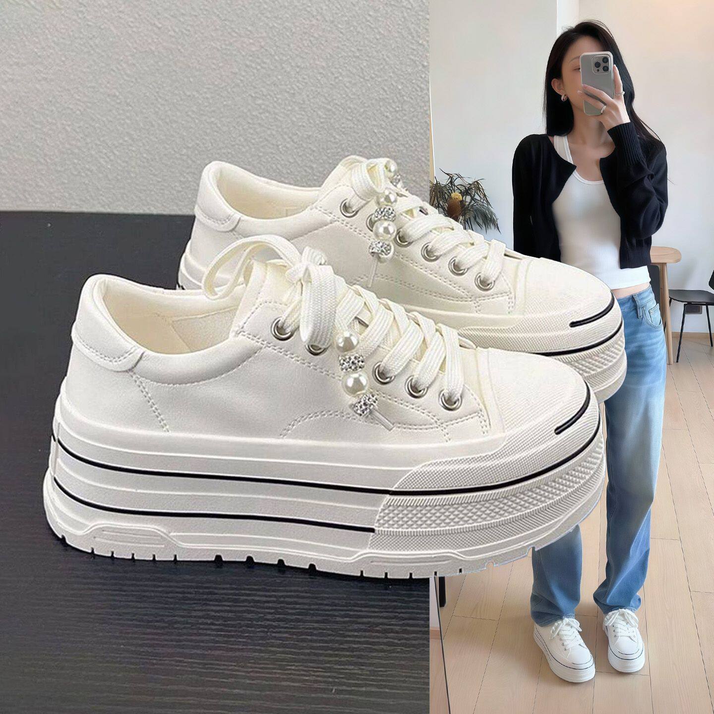 Hong Kong pearl leather platform sole heightened lace white shoes women's 2026 spring and autumn new versatile athleisure board shoes