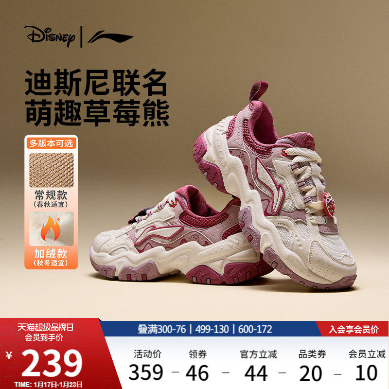Li Ning brown sugar Disney strawberry bear co-branded丨Casual shoes women's new winter fleece daddy shoes sports shoes