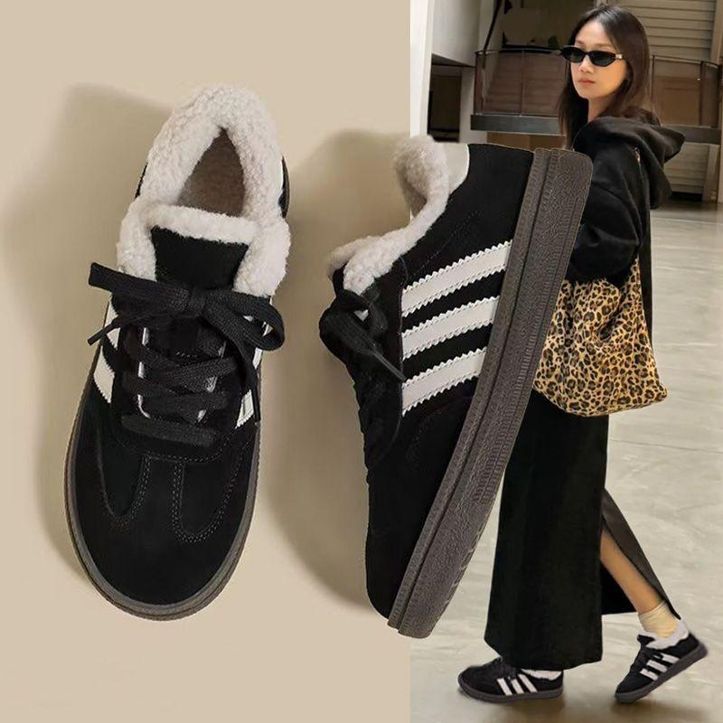 Hong Kong genuine leather lambswool German training shoes women's 2025 autumn and winter new fleece flat Forrest Gump sports and leisure board shoes