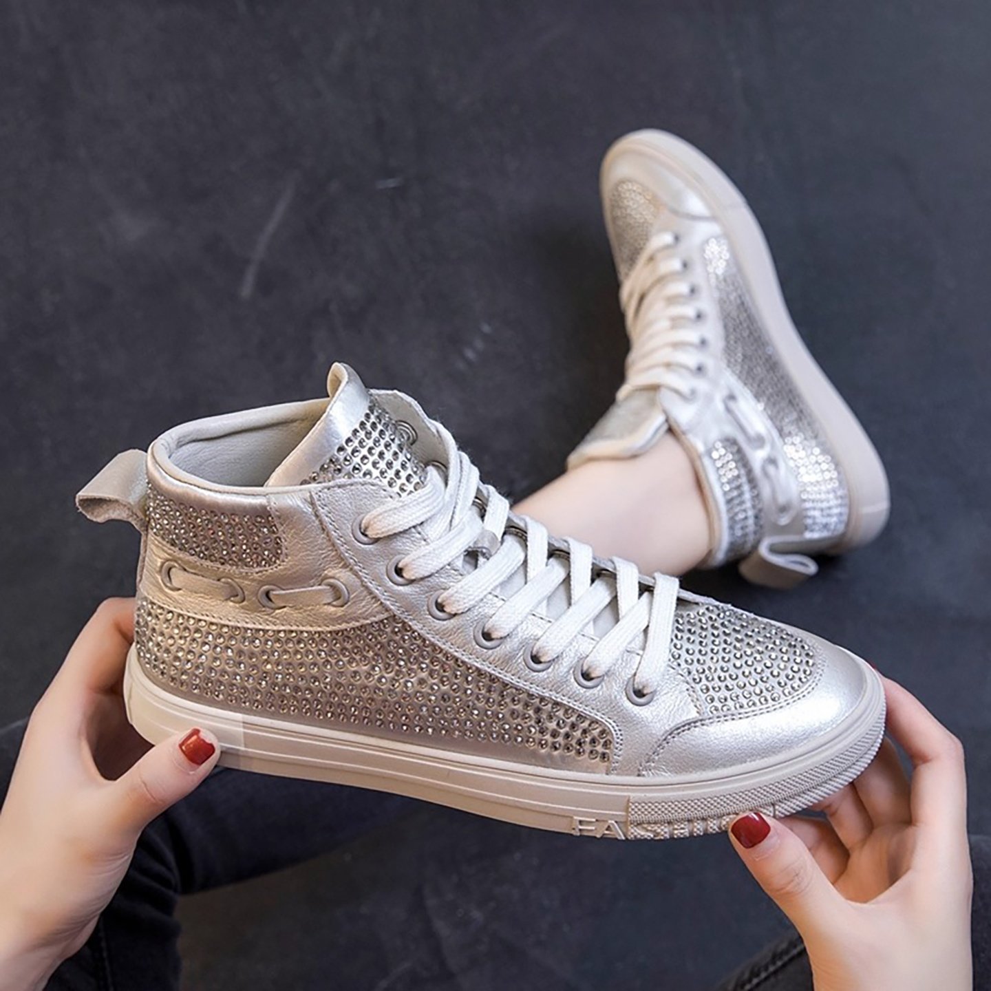 Hong Kong leather casual sports versatile bright diamond comfortable high-top shoes women's 2025 spring and autumn new flat student board shoes