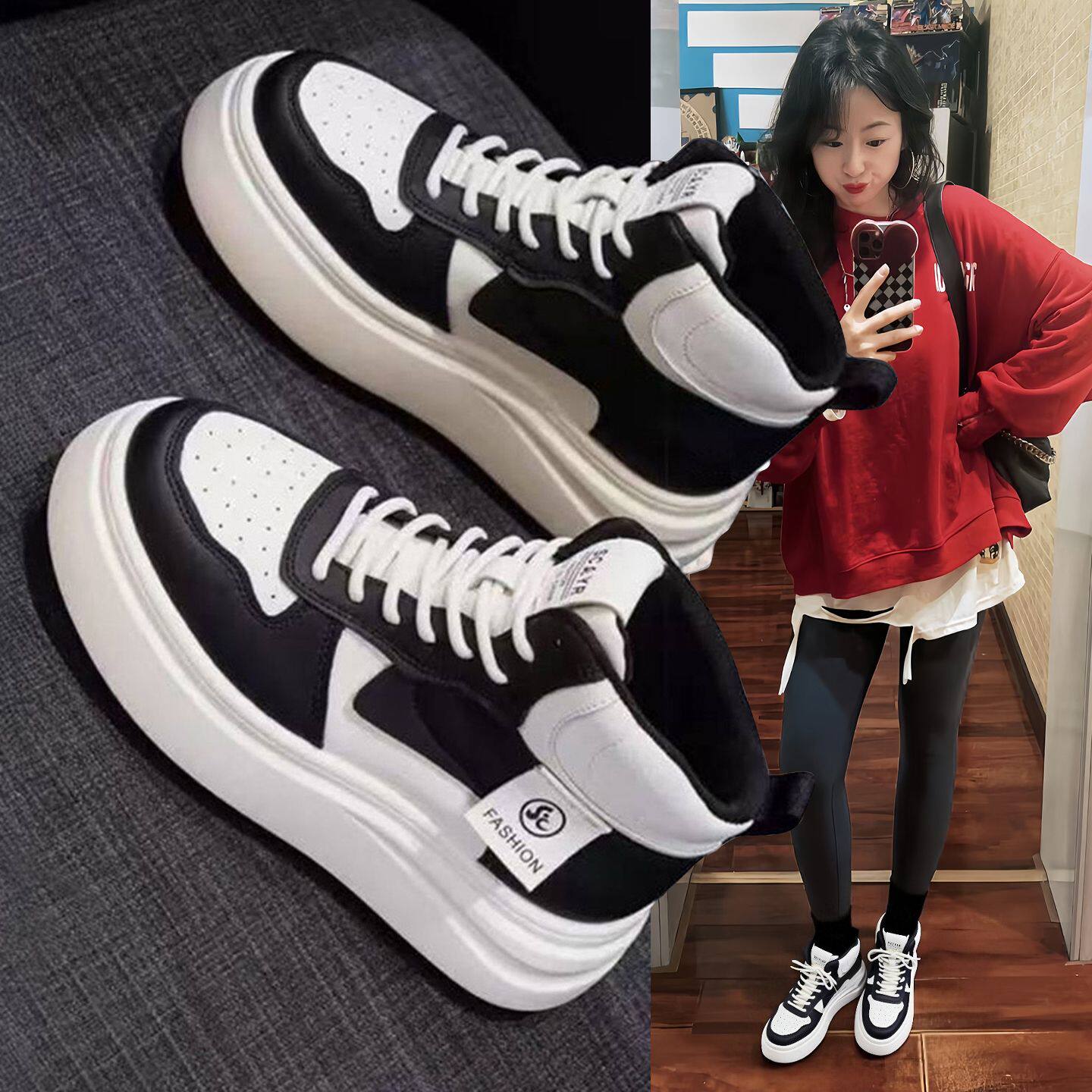 Hong Kong leather high-top white shoes women's 2025 autumn and winter thick-soled versatile panda color athleisure board shoes Korean version