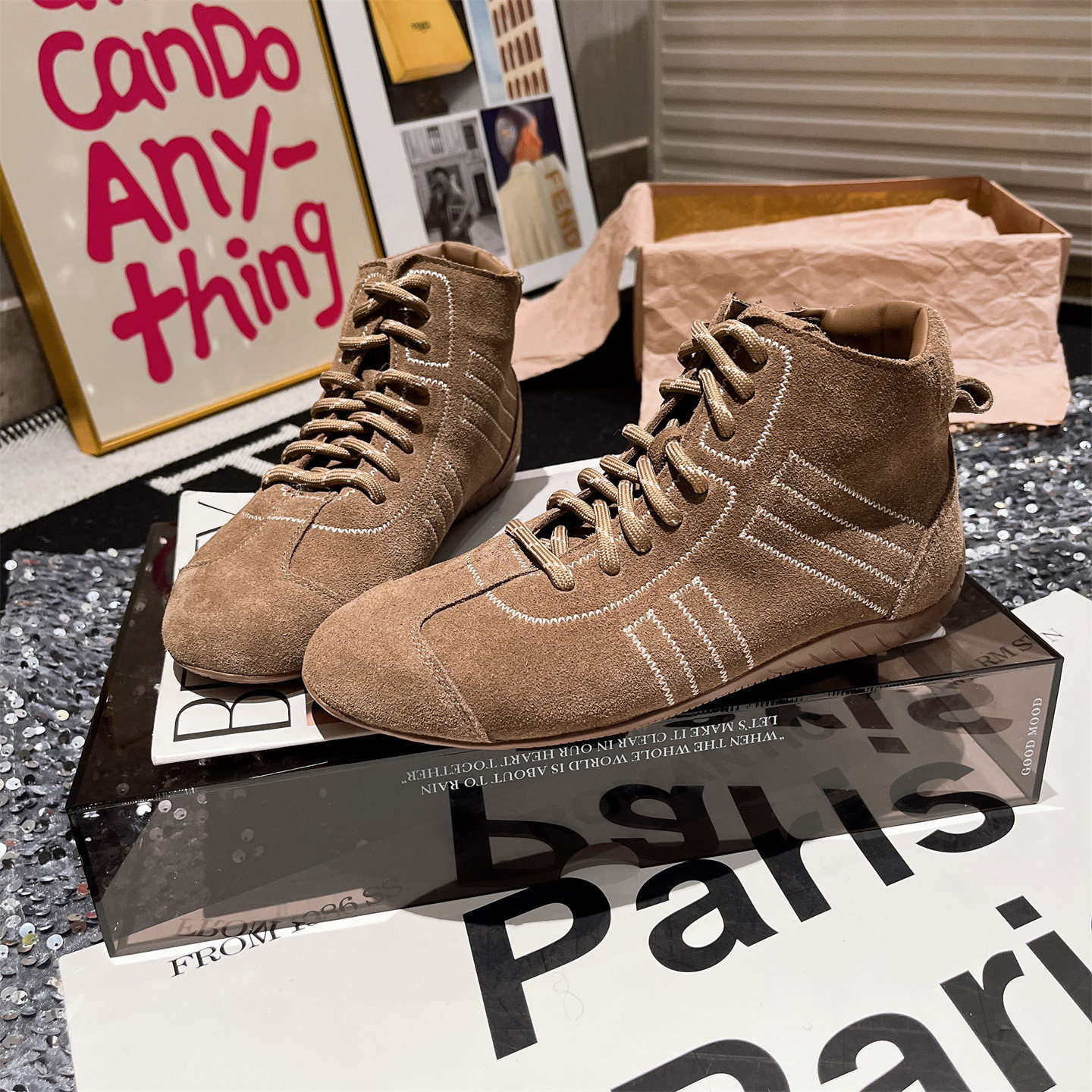 Hong Kong leather European lace-up boxing high-top shoes women's 2025 autumn and winter new fleece casual training shoes flats