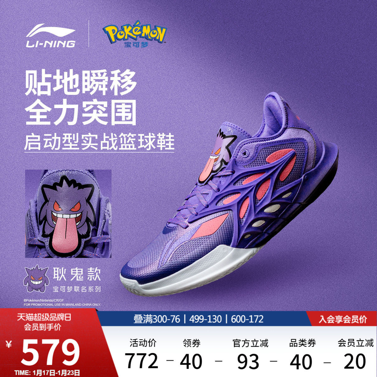Li Ning Pokémon co-branded series blitzkrieg 12 Gengar | Basketball shoes, men's shoes, cushioning practical low-top sneakers