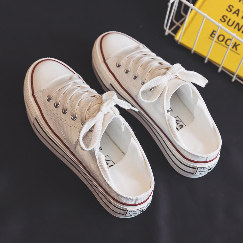 Korean spring new one shoe and two half-slipped platform canvas shoes, women's heels and half support casual white shoes