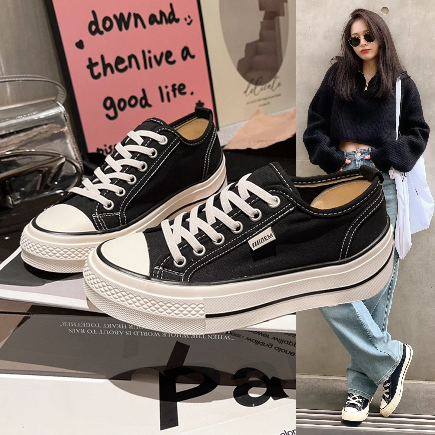 Tan Jianci smiled at the same style of canvas shoes, men's and women's platform beggar shoes, increased height, half-flip niche couple casual board shoes