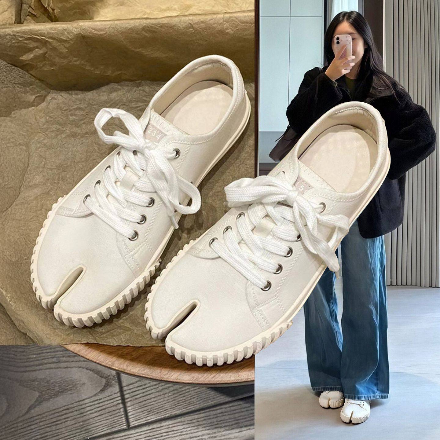 Hong Kong white shoes, tab-toe canvas shoes, women's 2025 spring and autumn pig's trotters, flat shoes, biscuit shoes, casual lace-up shoes