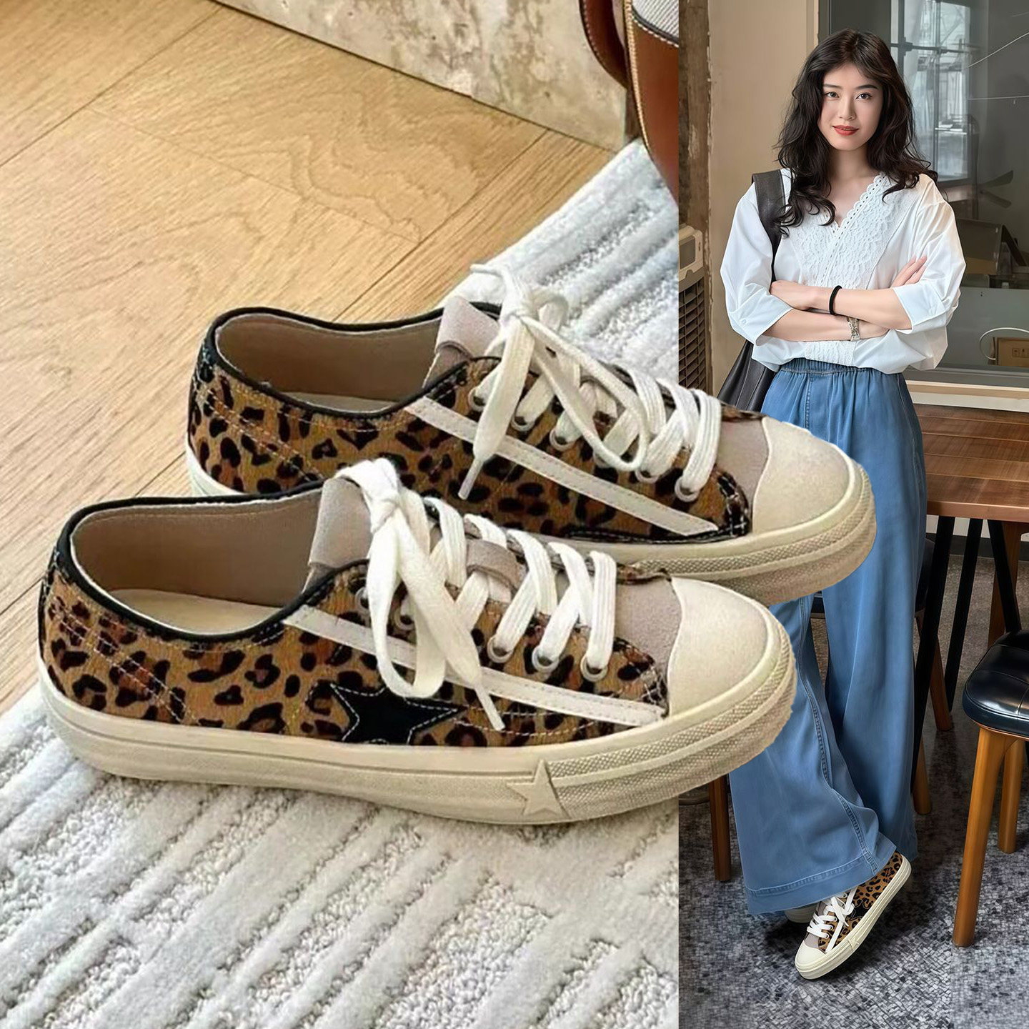 Hong Kong genuine leather distressed canvas shoes women's 2026 spring and autumn new casual shoes star leopard print lace-up versatile dirty dirty shoes