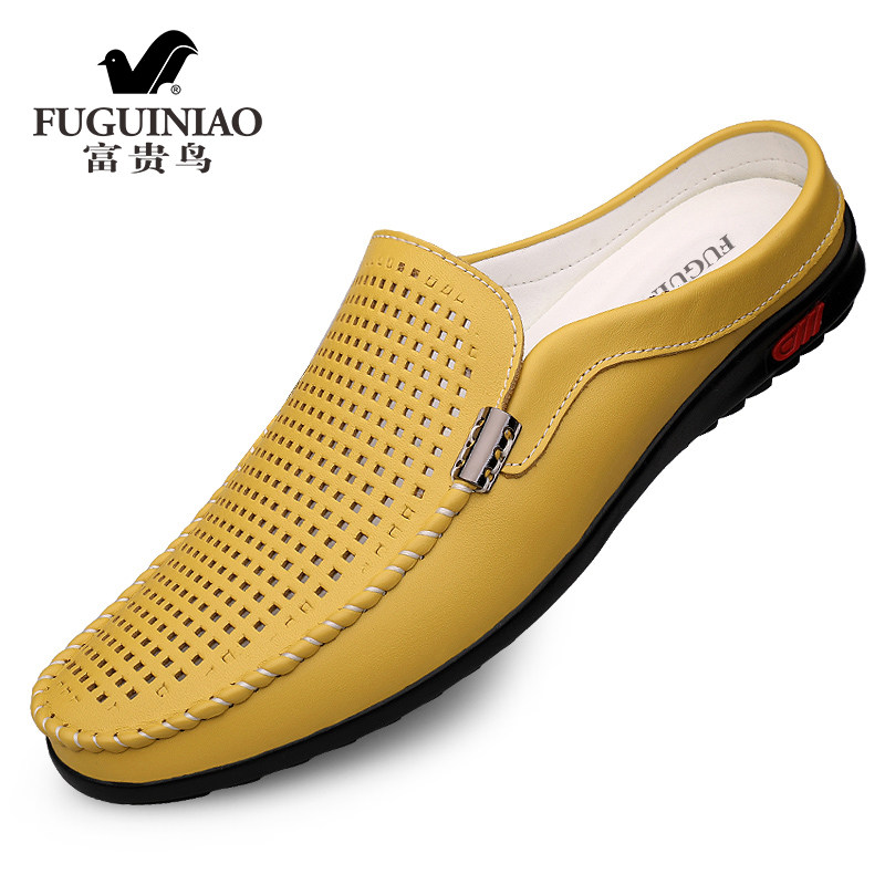Fuguiniao toe half slippers men's leather summer heelless lazy leather sandals soft soles breathable and versatile hole shoes