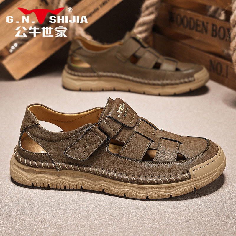 Bull Family Sandals Men's Shoes 2025 New Summer Anti-Odor and Anti-Slip Hollow Hole Shoes Men's Leather Sandals Outside