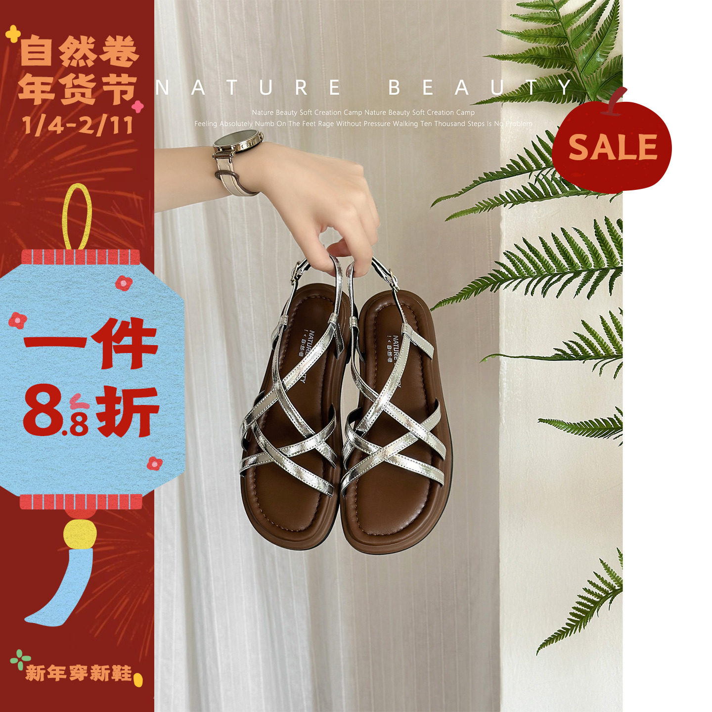 Natural roll flat casual strappy temperament Roman sandals 2025 summer new open-toe vacation fairy beach shoes