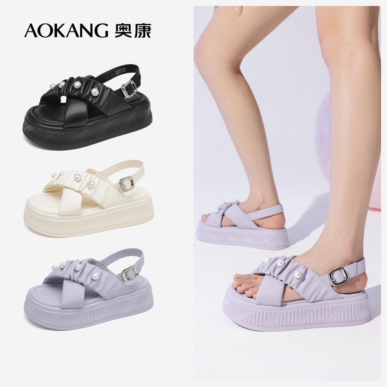 【Platform Sandals】Aokang Women's Shoes New Soft Pearl Rhinestone Outside Slippers Fashion Sandals