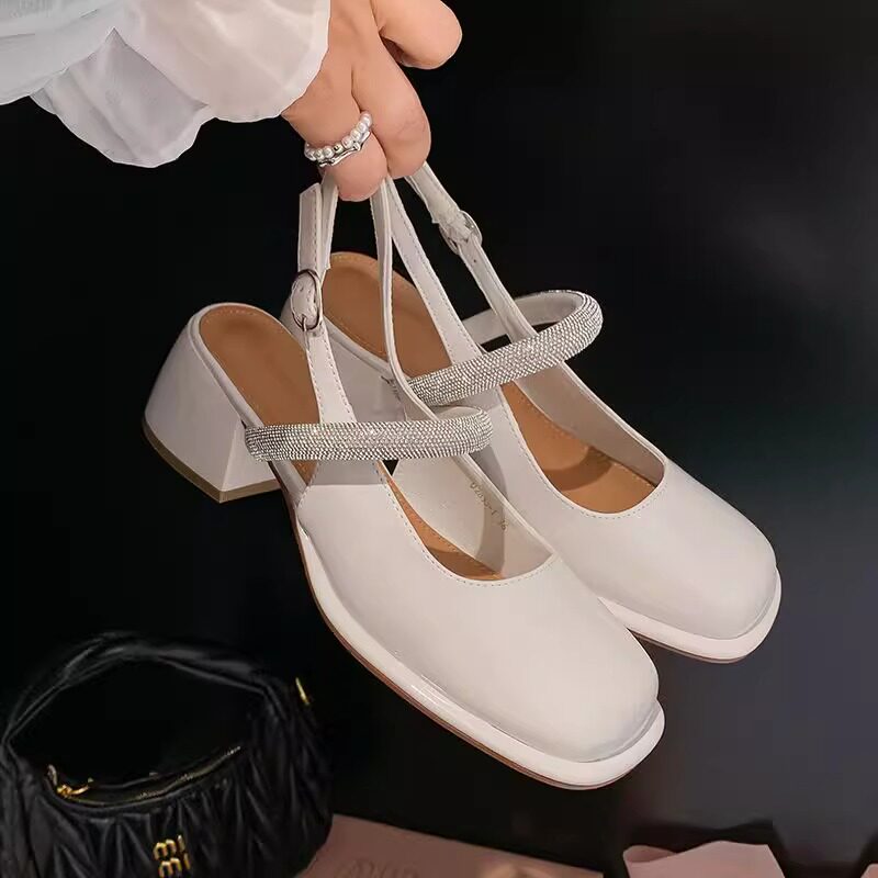 Hong Kong Mary Jane Shoes Women's 2026 Spring and Summer French Genuine Leather Small Heels Temperament Small Leather Shoes Rhinestone Versatile Women's Sandals