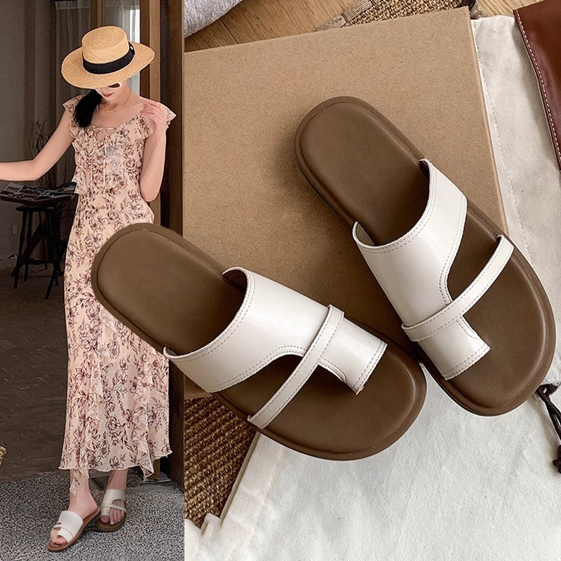 Hong Kong leather slip-on toe clip-on sandals for women wear 2026 new flat clip-toe casual beach slippers for summer outside