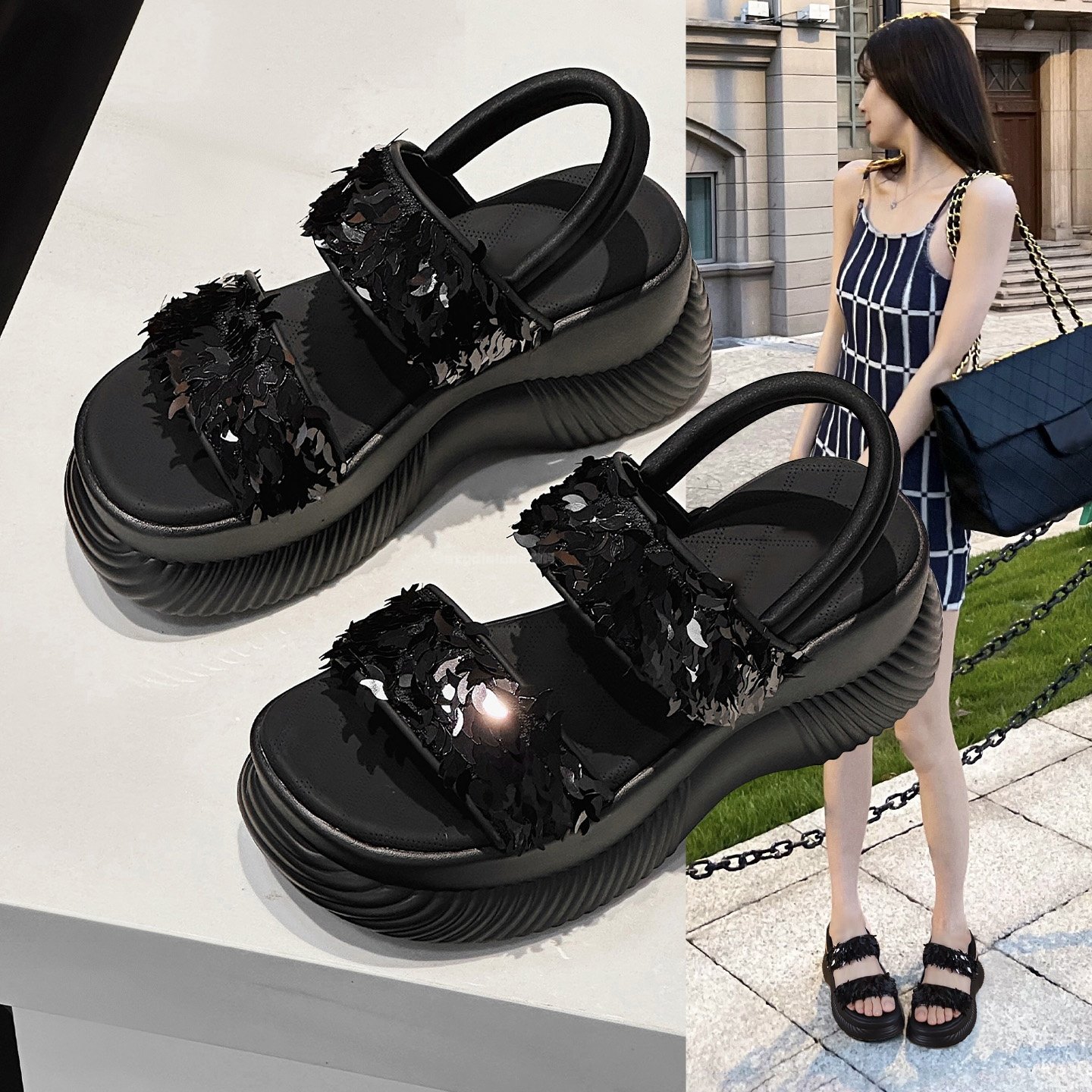 Hong Kong fashion sequin open-toe sandals women's 2026 summer new small thick sole height-increasing versatile casual beach shoes