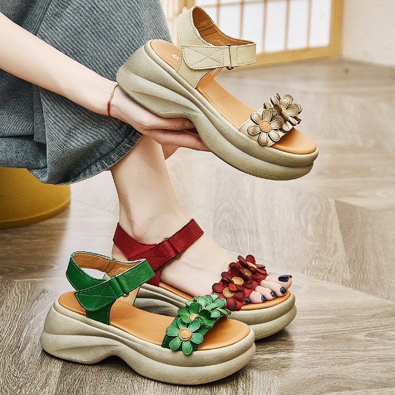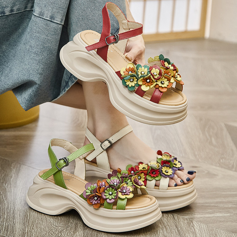 New Chinese platform fish mouth shoes 2025 new summer muffin roma shoes leather vintage flower women's sandals