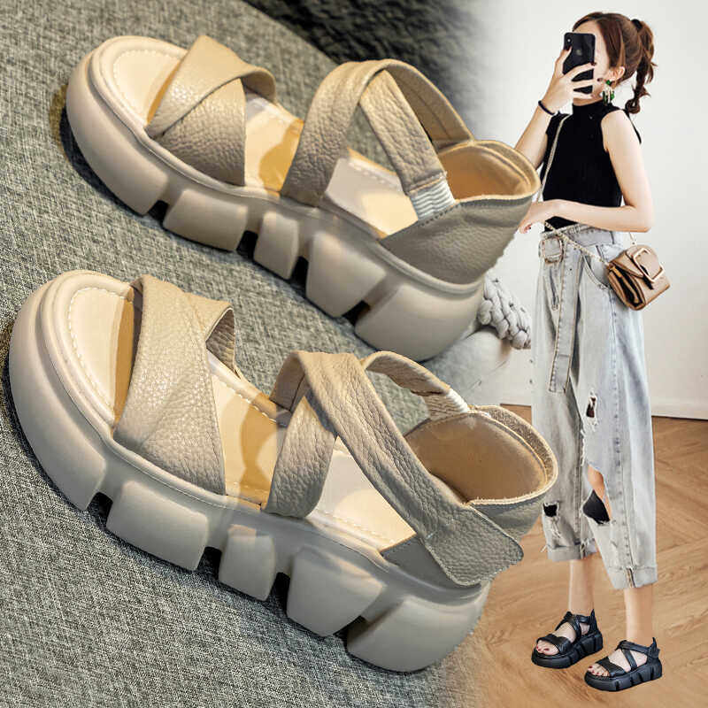 Top layer cowhide sandals women's new summer 2025 outer wear cross strap platform platform versatile leather Roman athleisure