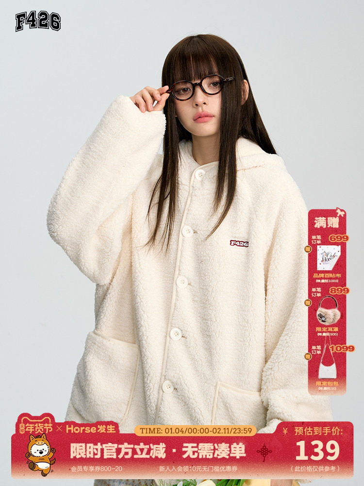 【F426 Official Store】National Trend Brand Winter Couple Dopamine Small Logo Hooded Button Plush Jacket