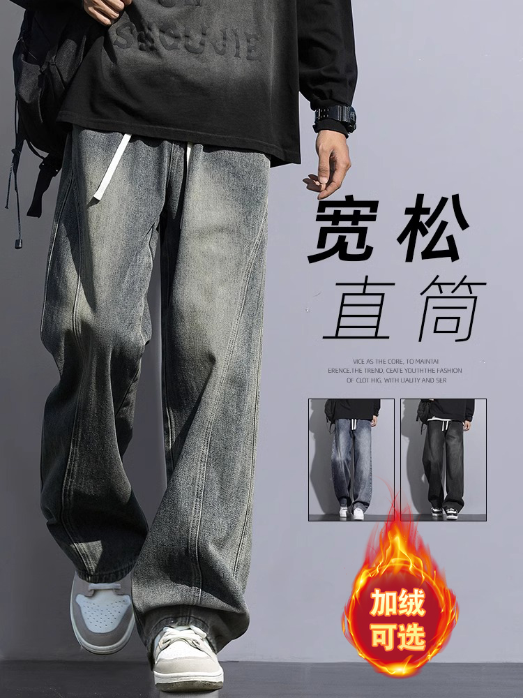 Maxdstr Small Curved Knife Cut Style Distressed and Dyed Heavy Denim Jeans for Men, Loose Fit, American Retro Style Long Pants