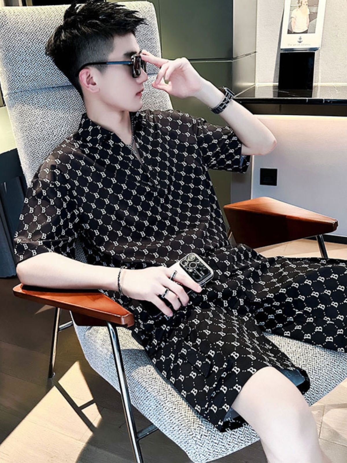 Summer Thin Ice Silk Short-Sleeved Shirt Set for Men, Fashionable and Handsome, Loose Short-Sleeved Shorts, Comfortable and Casual Two-Piece Set
