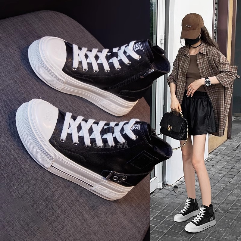 Sanli Genuine Leather High-Top Shoes for Women 2025 Spring and Autumn New Thick-Soled Height-Increasing Casual Shoes Versatile Lace-Up Platform Sneakers