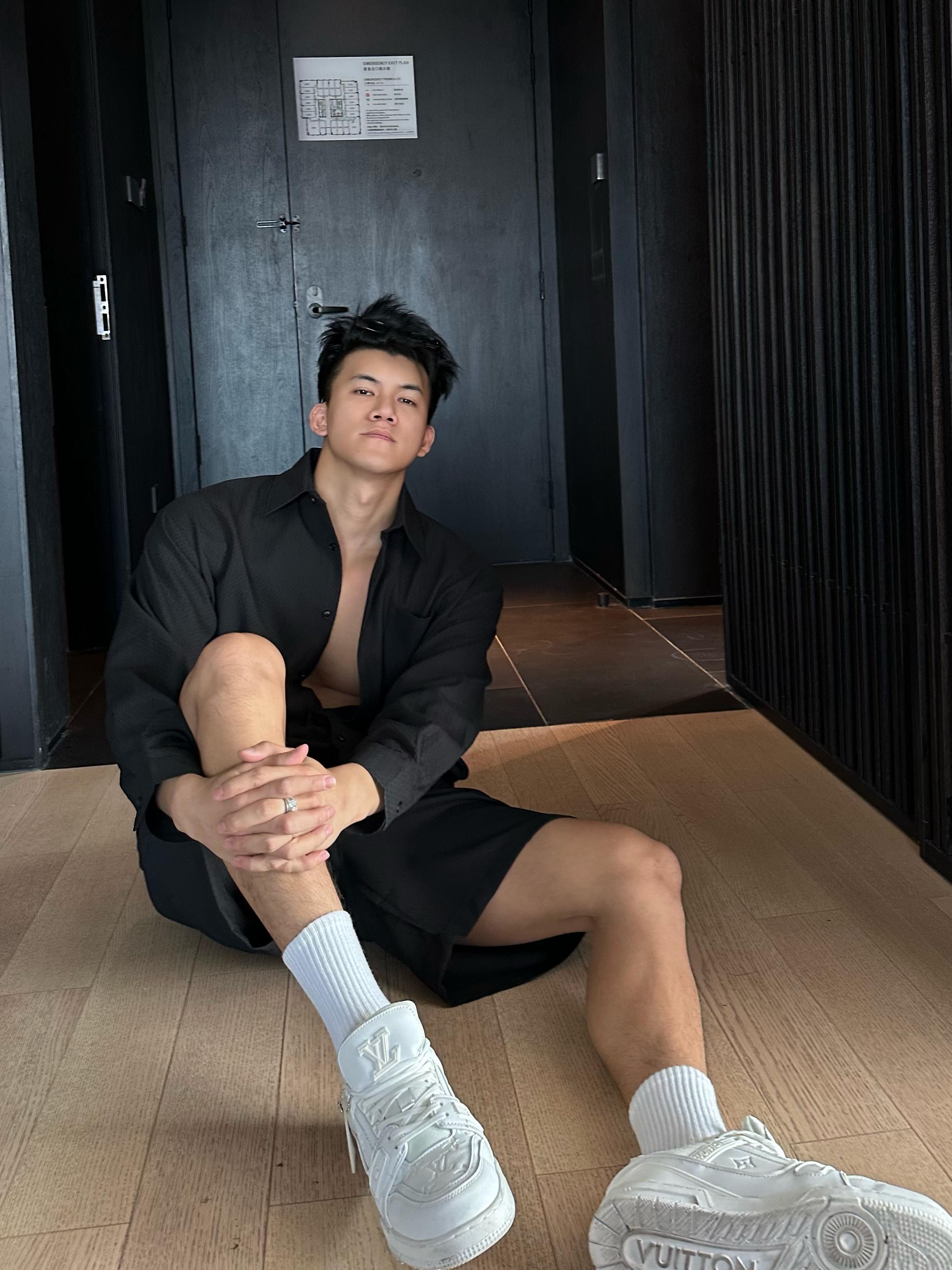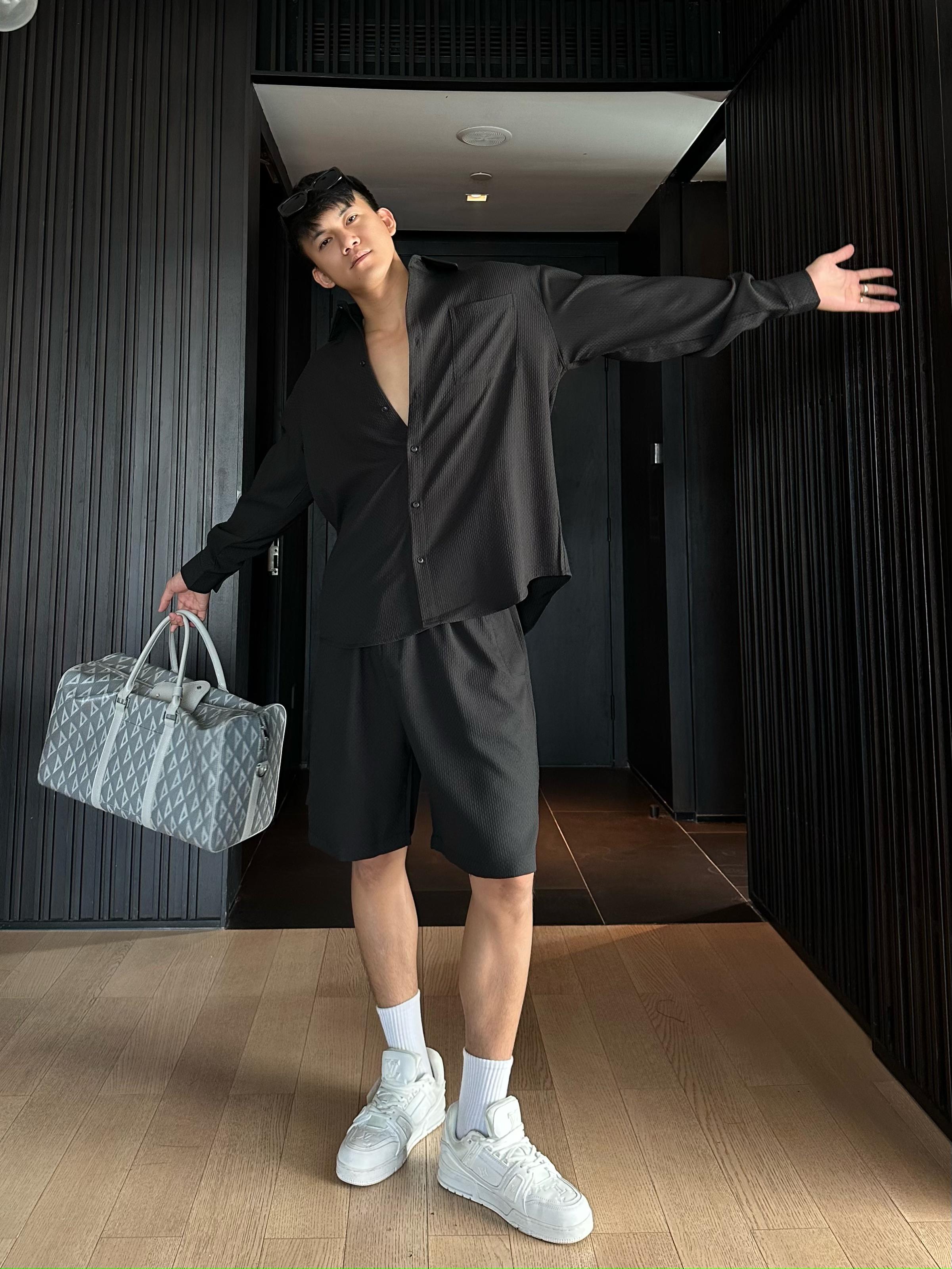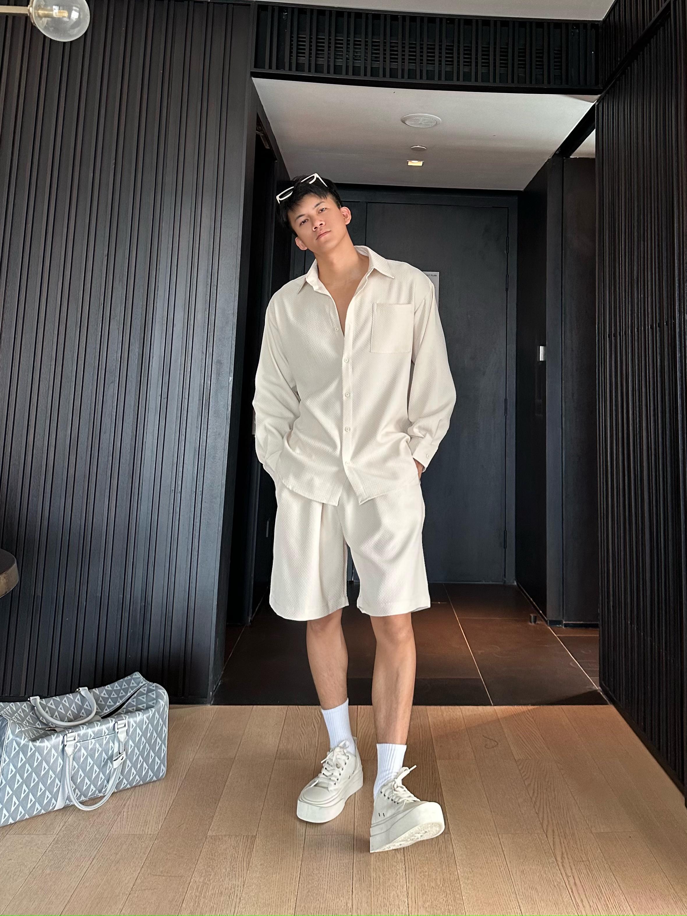 JZD apricot/Black autumn daily relaxation feeling waffle Loose Casual Long sleeves shirt shorts Fashion Suit