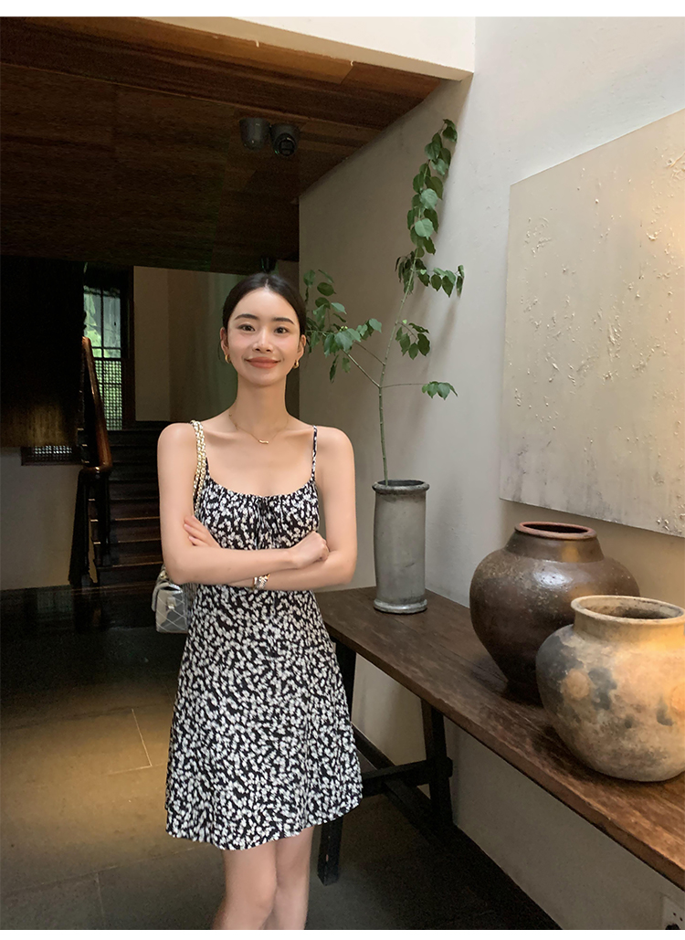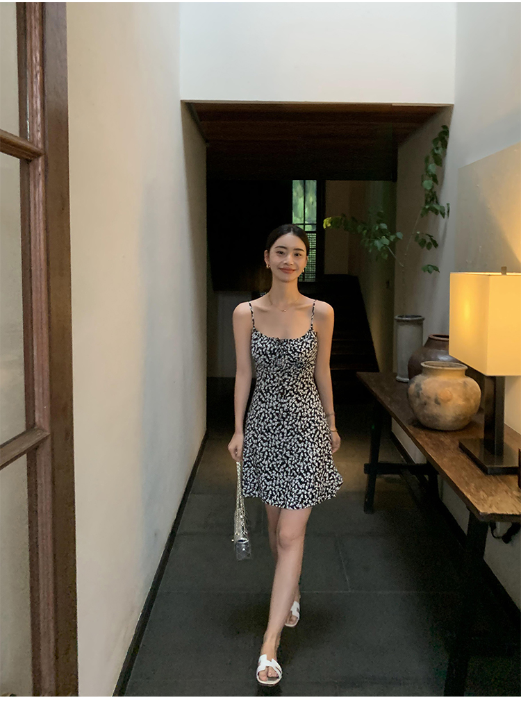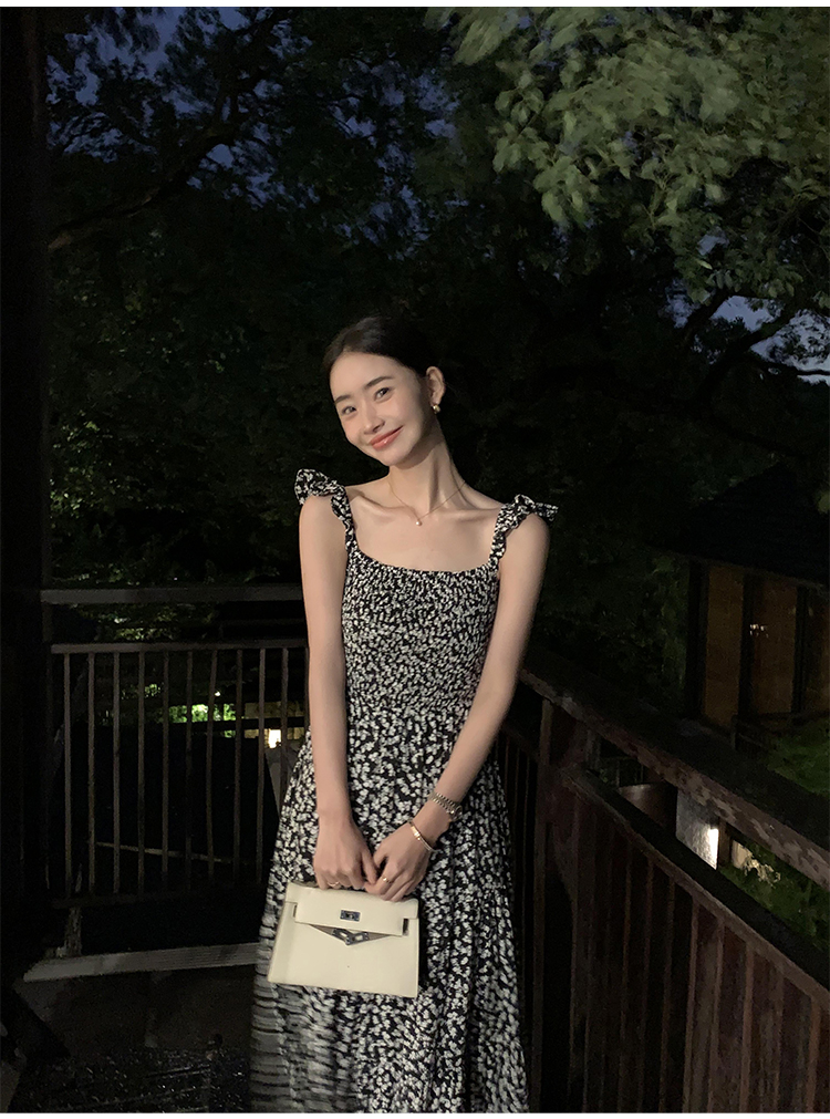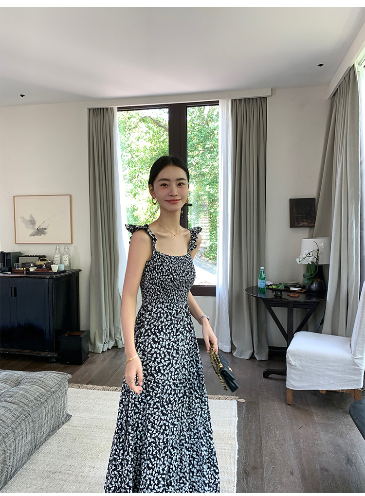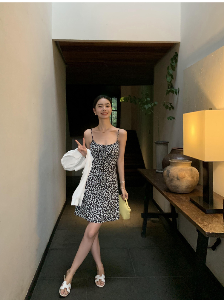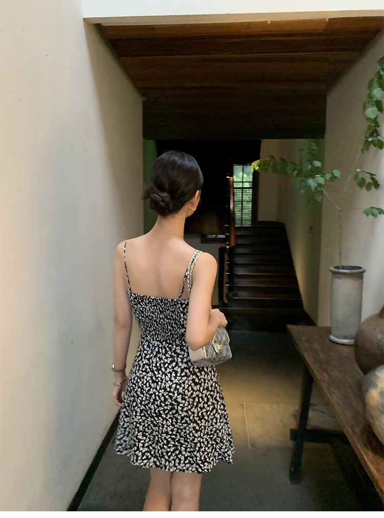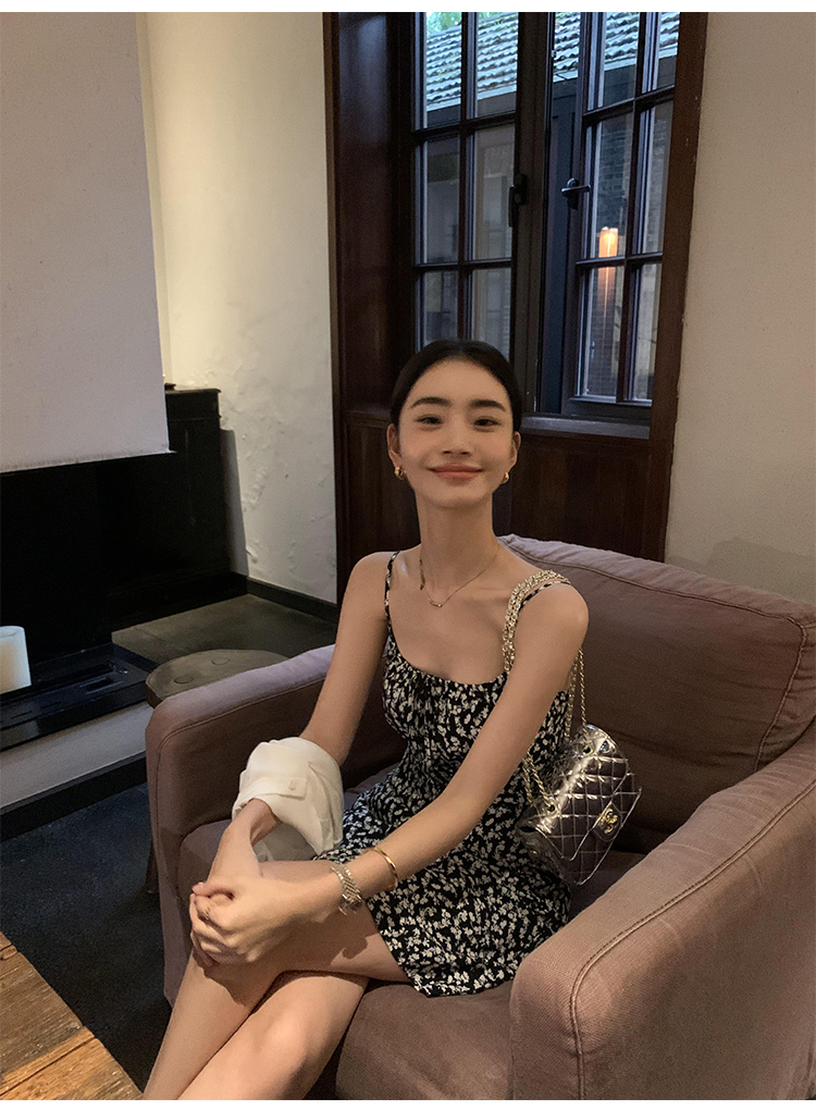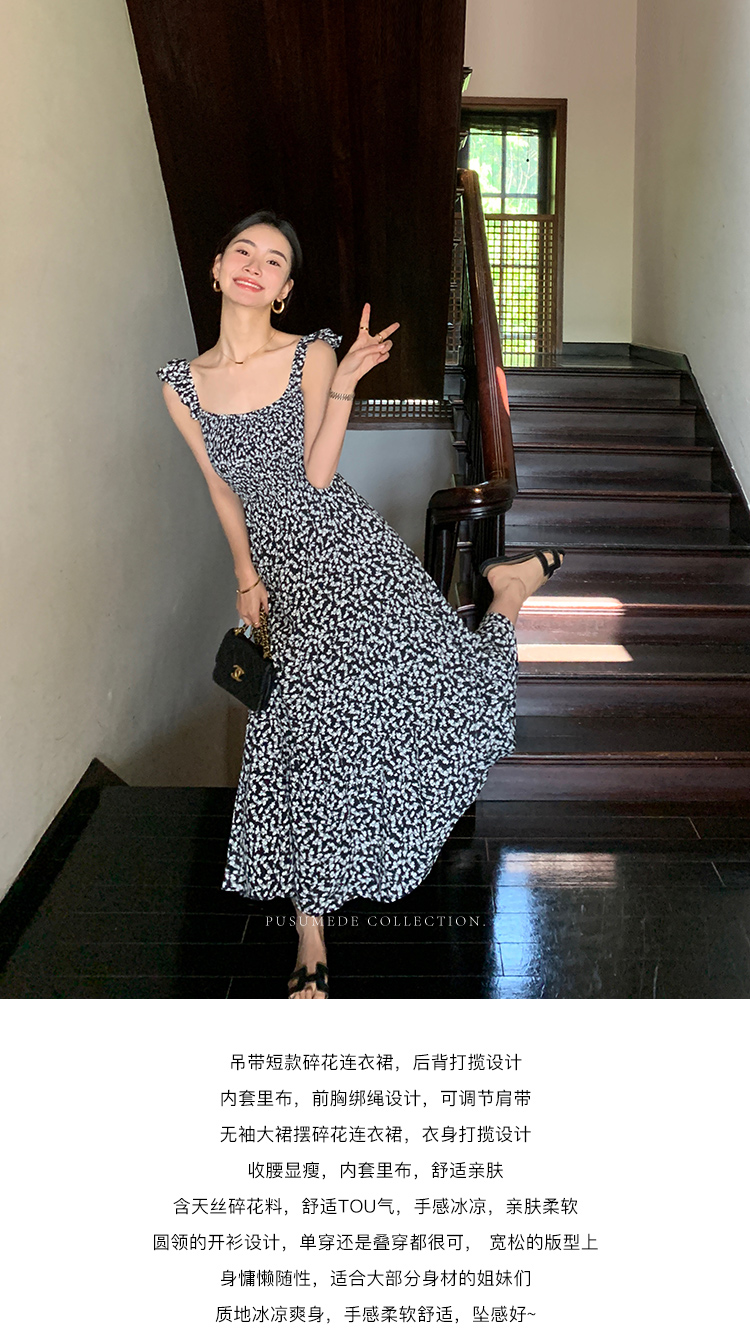 Pusumede French-Style Tea Break Black Floral Dress for Women, Summer 2025, Waist-Cinching, Elegant Spaghetti Strap Dress, Short Style