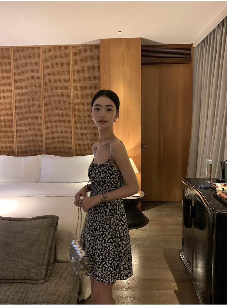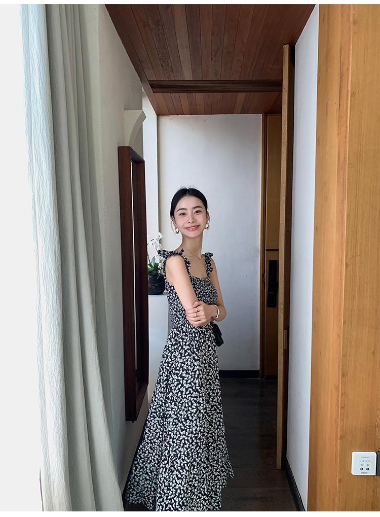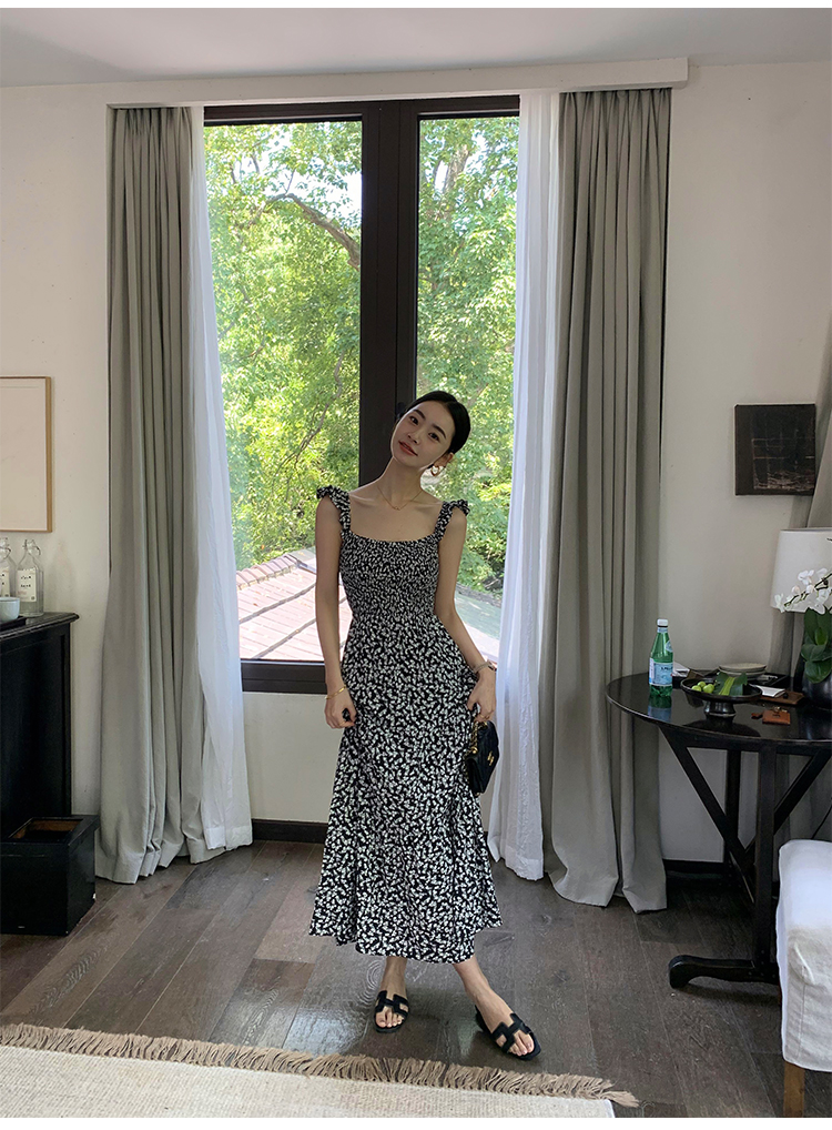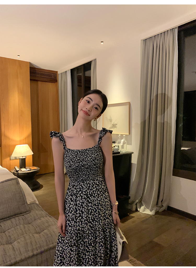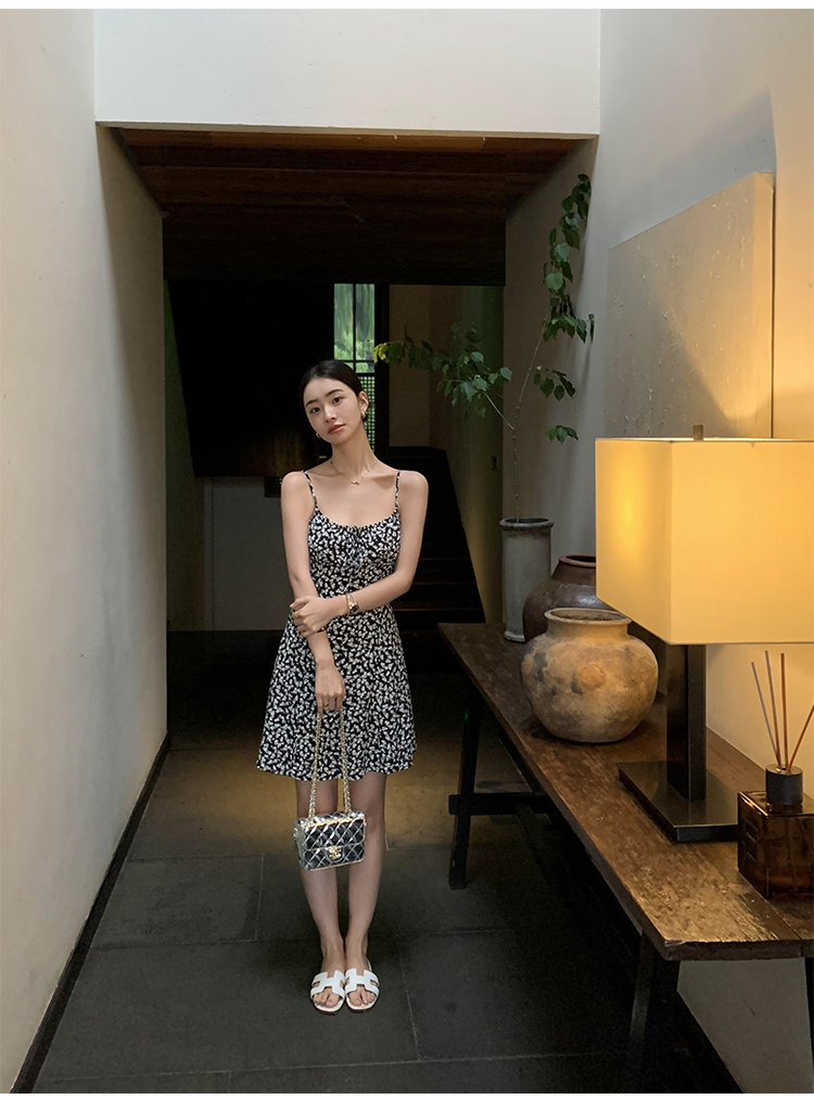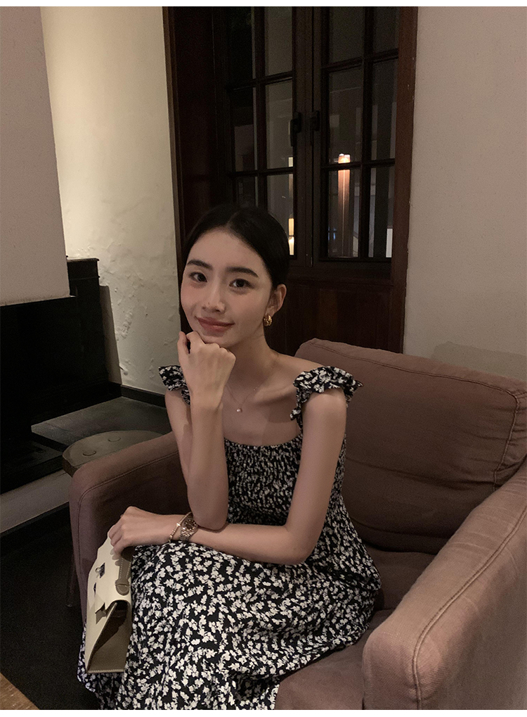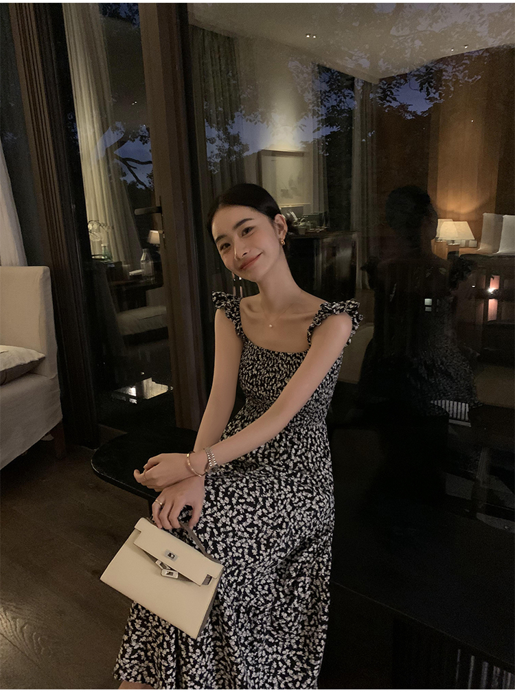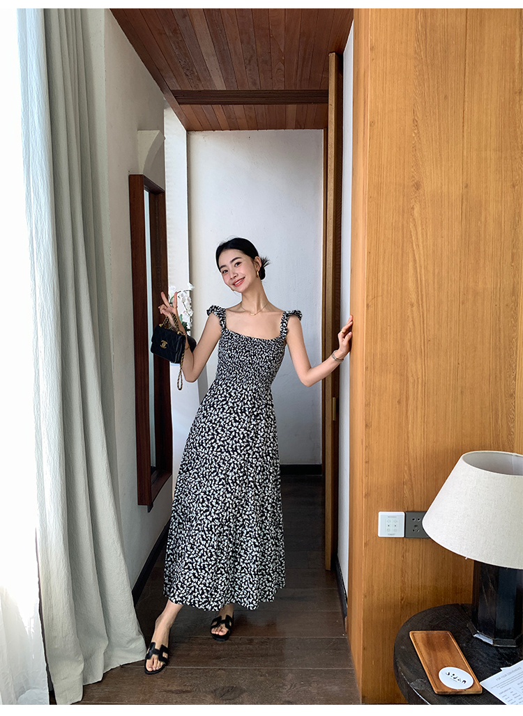Pusumede French-Style Tea Break Black Floral Dress for Women, Summer 2025, Waist-Cinching, Elegant Spaghetti Strap Dress, Short Style