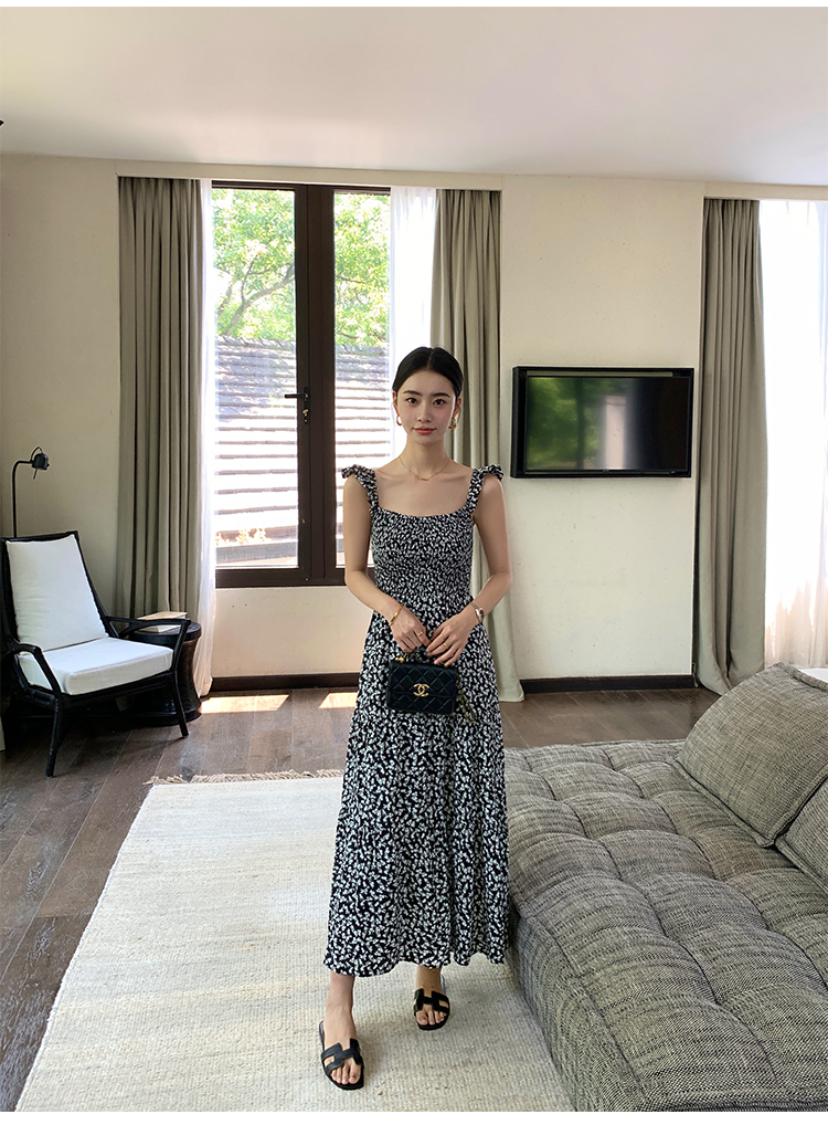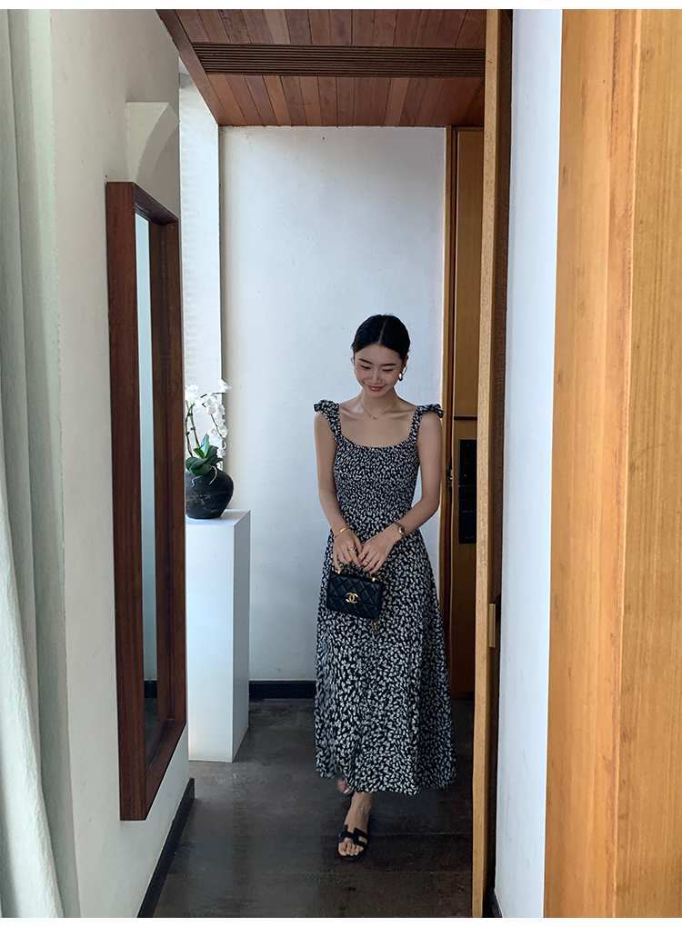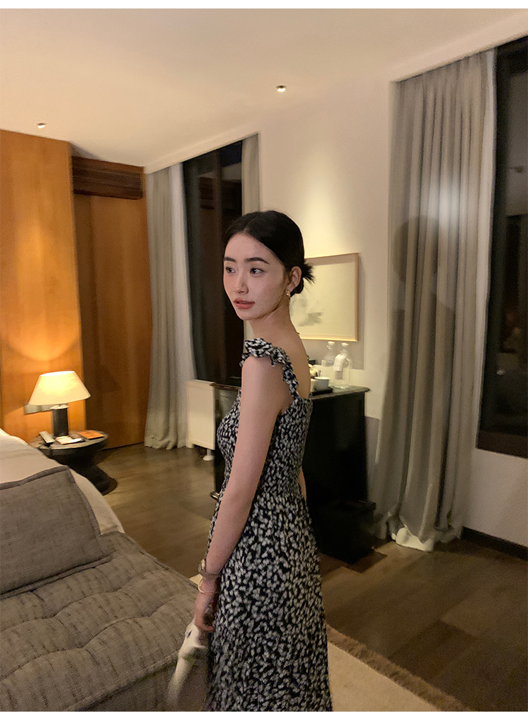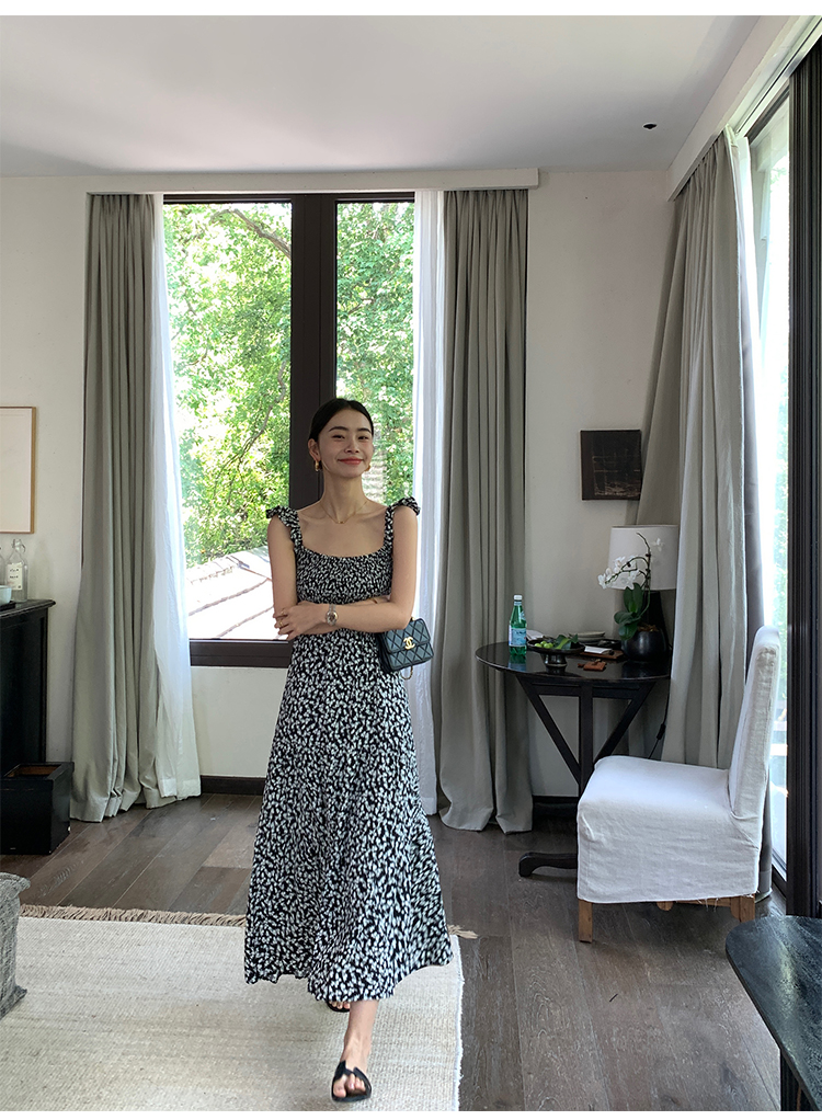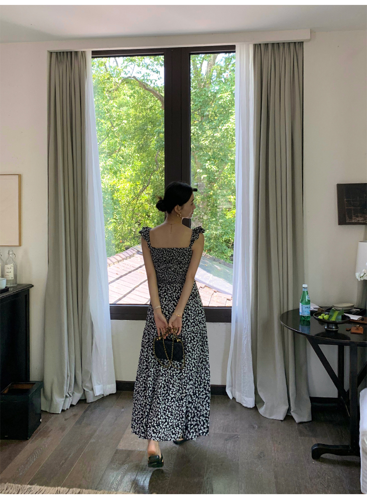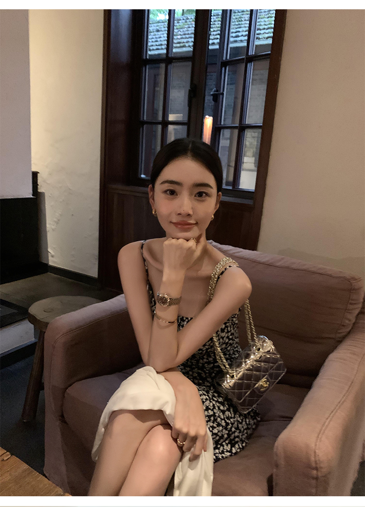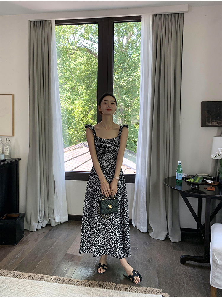 Pusumede French-Style Tea Break Black Floral Dress for Women, Summer 2025, Waist-Cinching, Elegant Spaghetti Strap Dress, Short Style