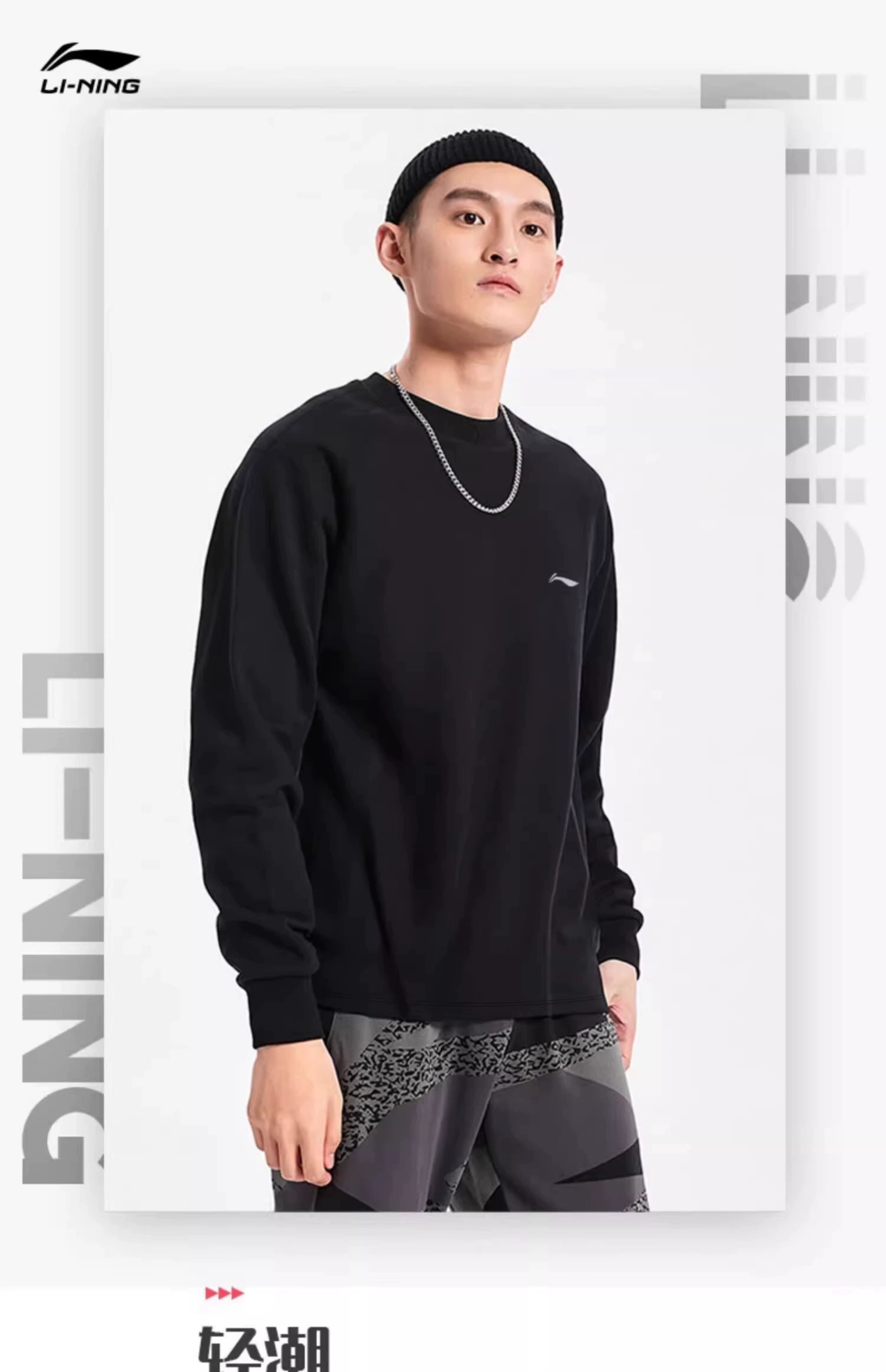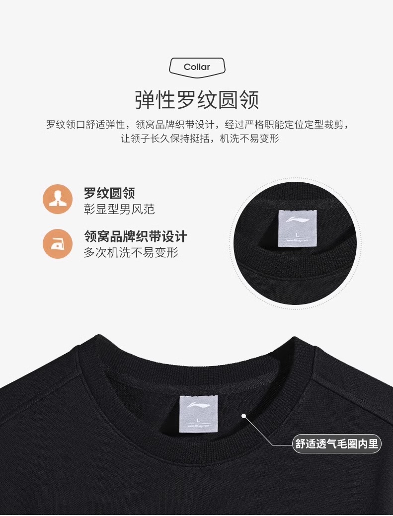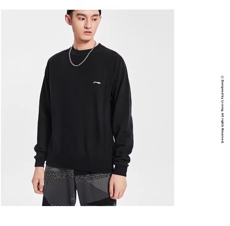 Li Ning Sweatshirt for Men, New Autumn Collection, Black Crew Neck Pullover, Large Size, Loose Fit, Casual Long-Sleeve Top for Spring and Autumn